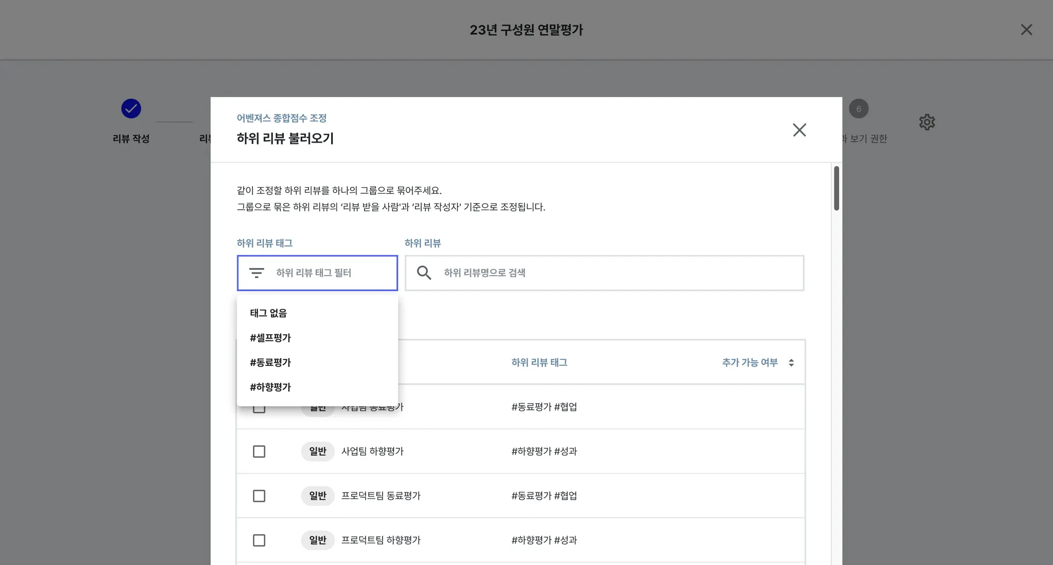 예시) ‘#동료평가’ 태그는 동료 평가로 적용된 리뷰를 선택합니다.