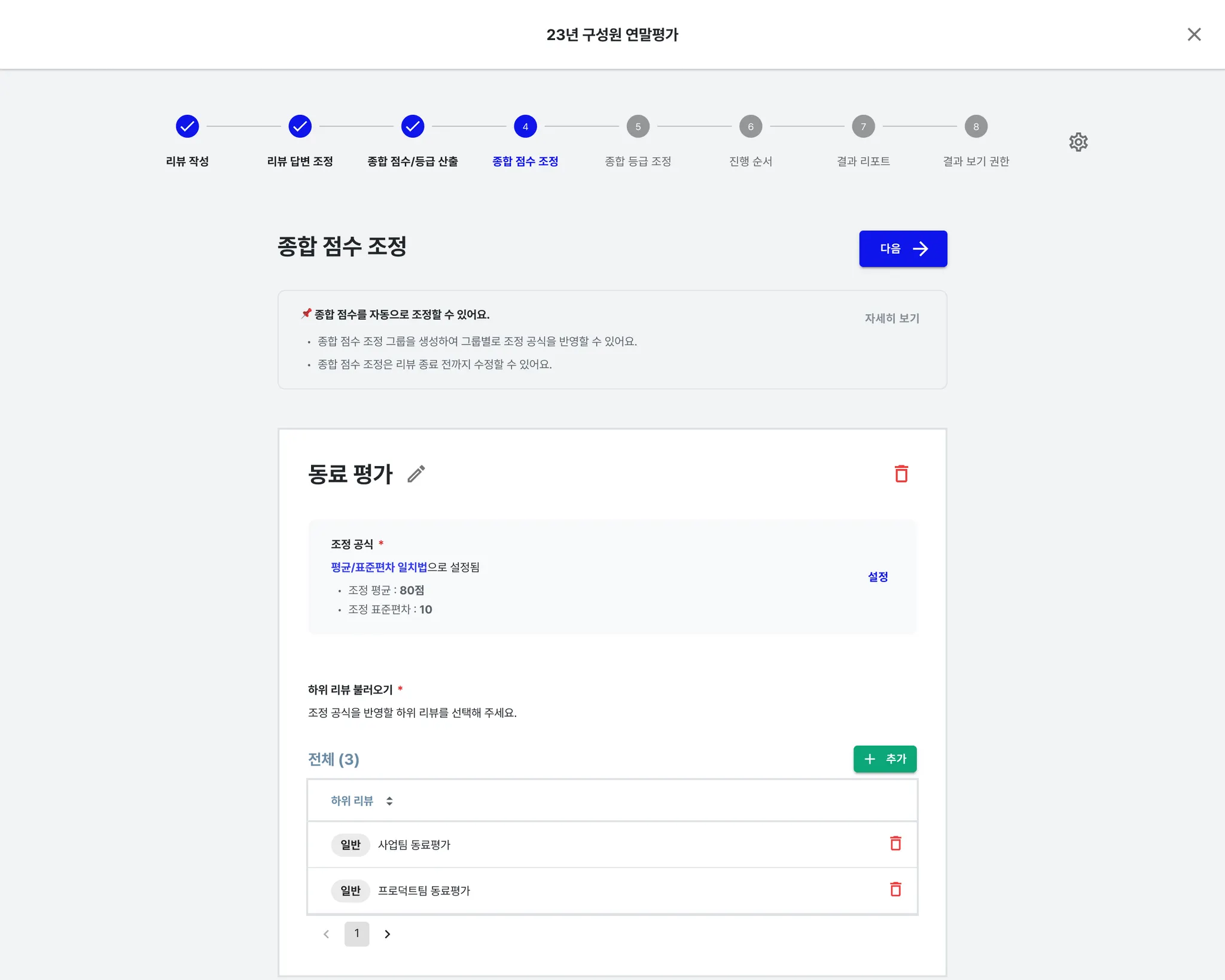 결과 리포트 설정 단계와, 종합 점수 조정 시 활용할 수 있습니다.