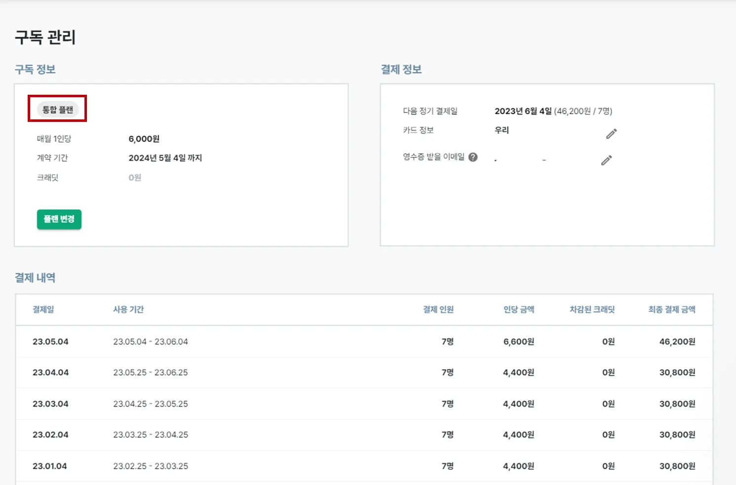 구독 정보를 통해 자신의 플랜을 확인할 수 있어요.