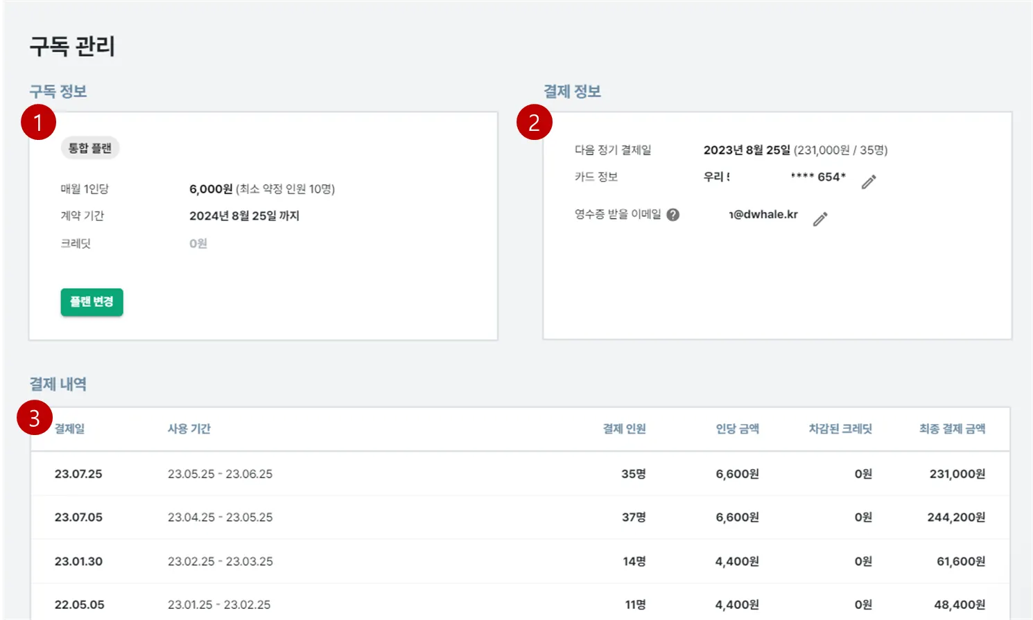 월별 결제 내역과 추가 인원에 대한 결제 내역 확인이 가능합니다.