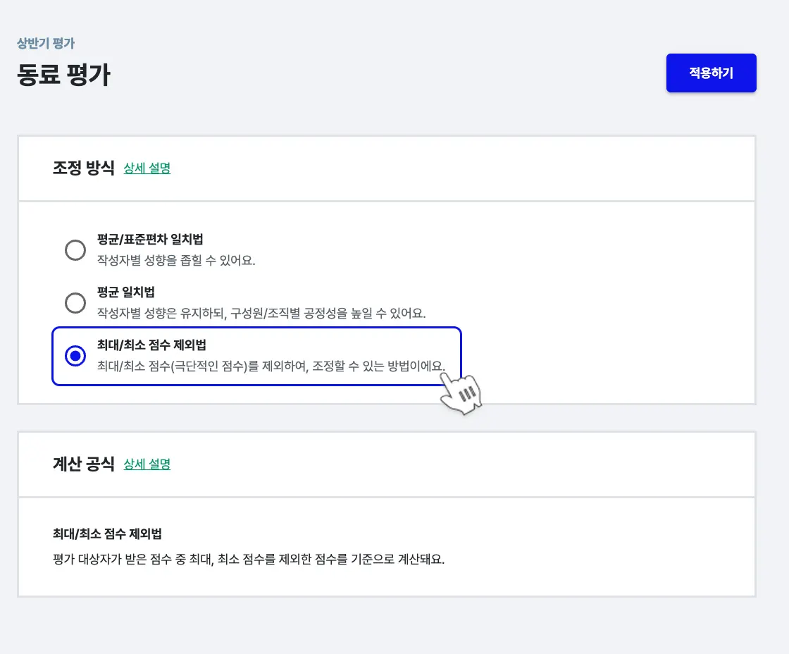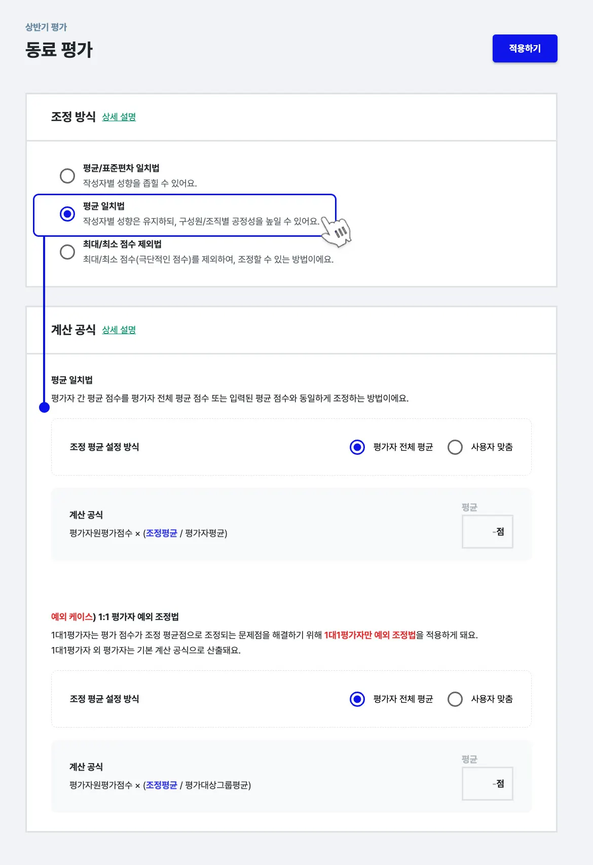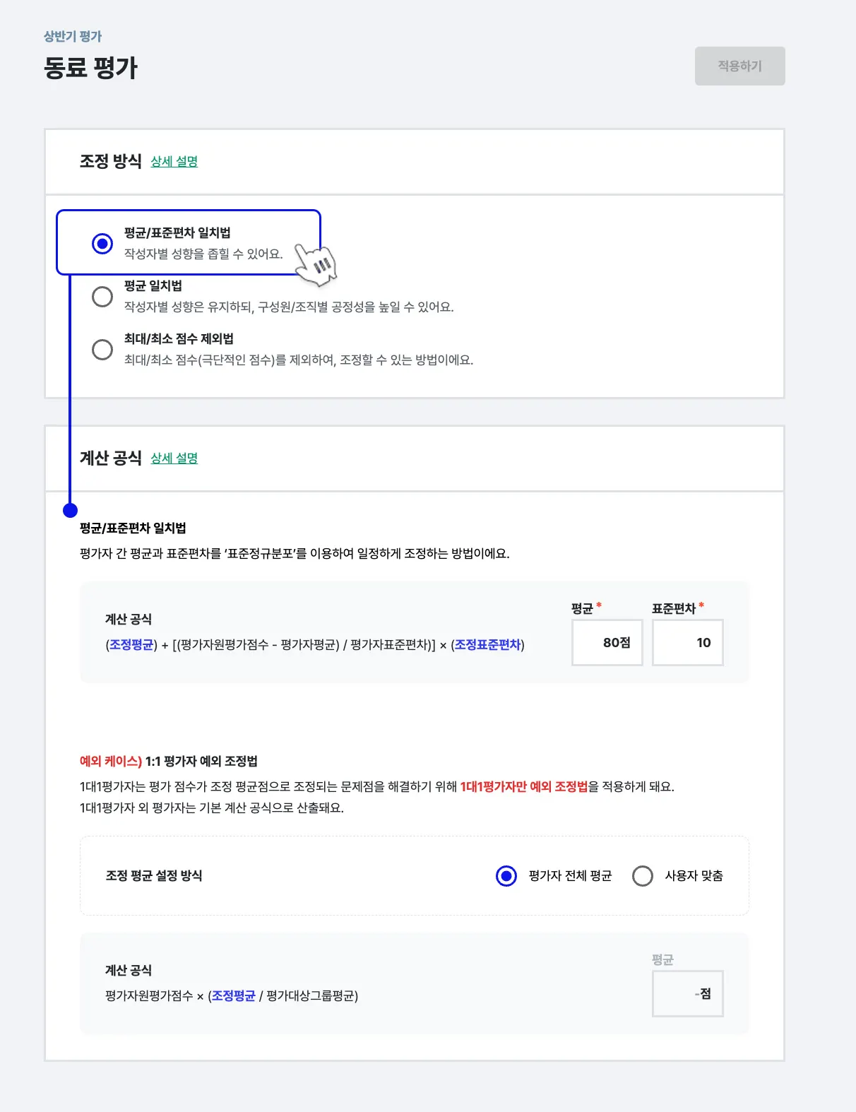 관리자가 설정한 조정평균을 기준으로 점수 조정하는 사용자 맞춤형 중 선택합니다.