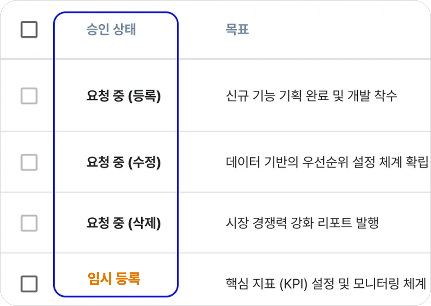 (1) 승인 상태에서 ‘임시 등록’으로 표시된 목표는 아직 승인 요청을 진행하지 않은 목표의 상태를 말합니다.