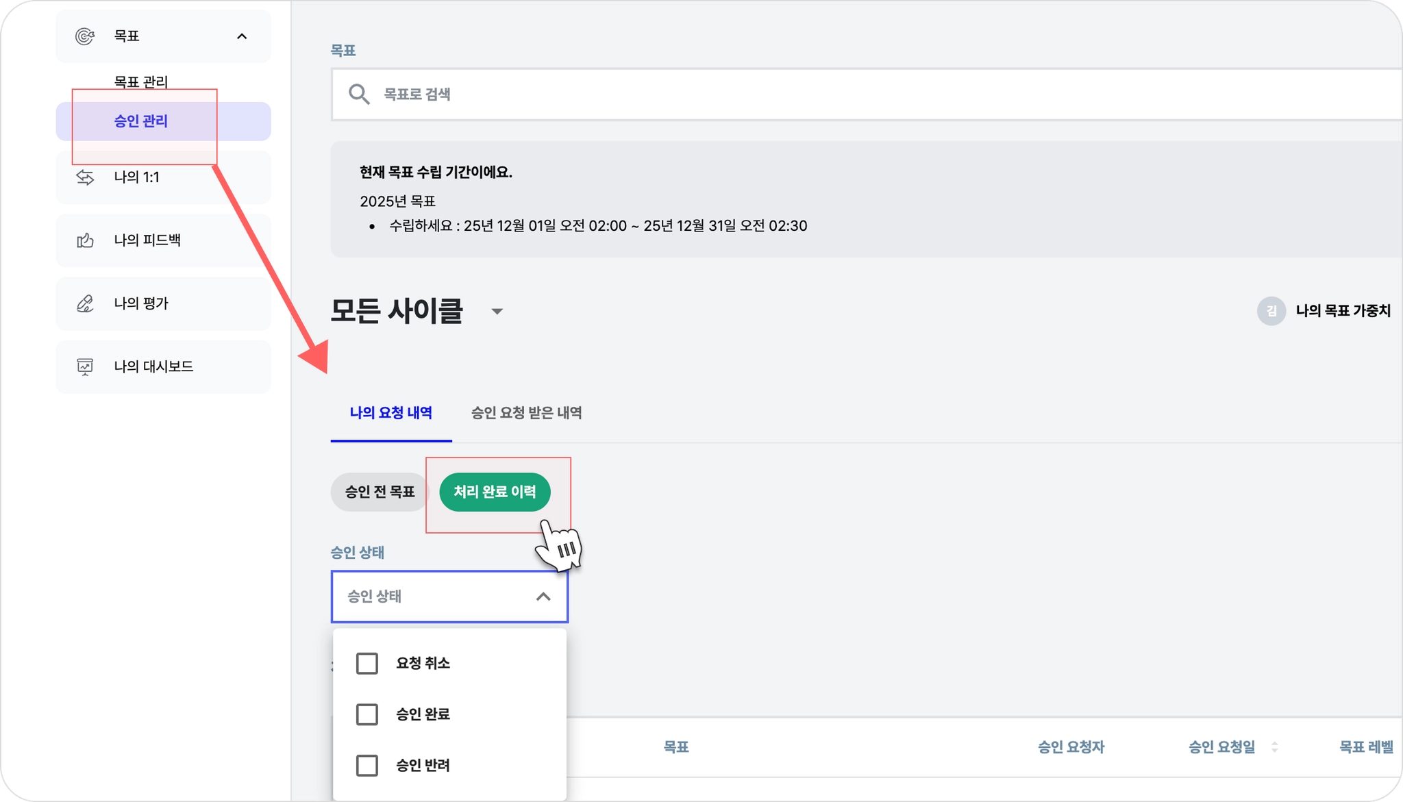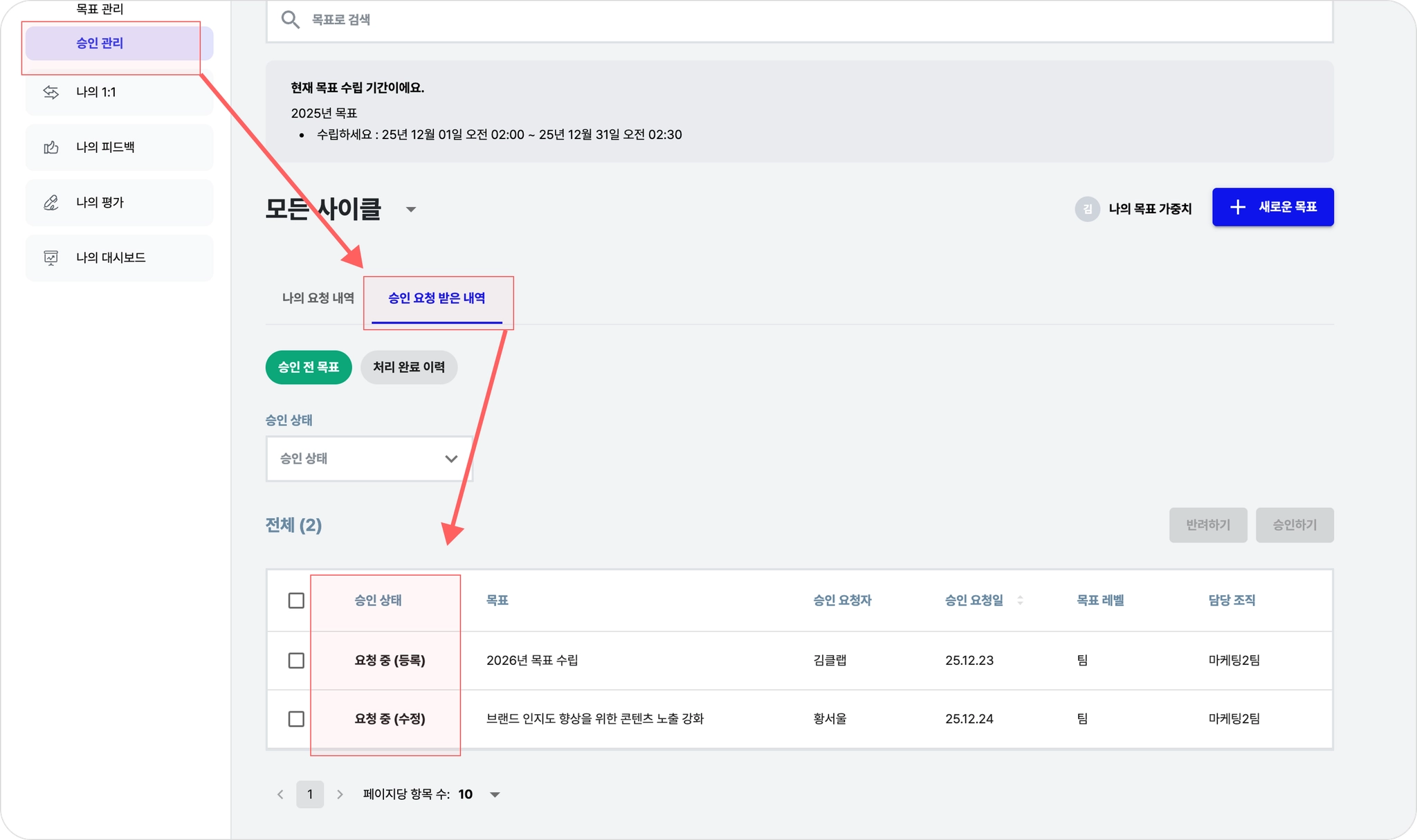 모든 단계를 마치면 목표의 승인 상태가 '요청 중(등록)'으로 변경된 것을 확인할 수 있습니다.