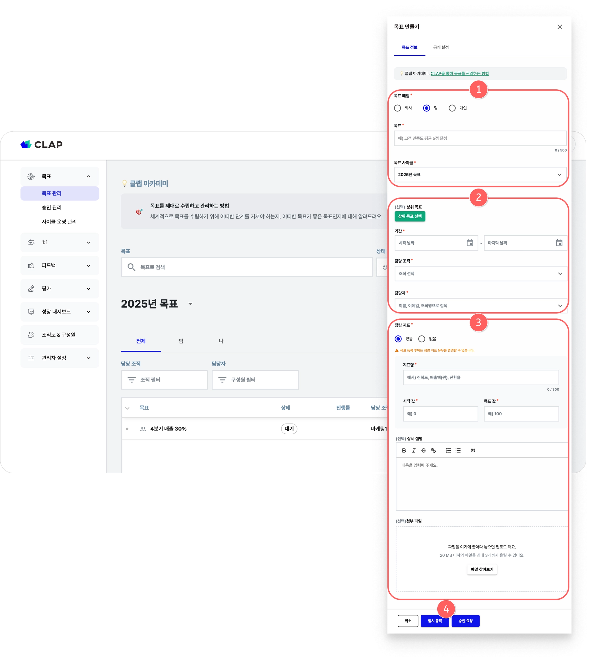 목표 만들기에서는 상위 목표, 사이클, 기간, 담당 조직 등 세부 항목을 설정할 수 있어요.