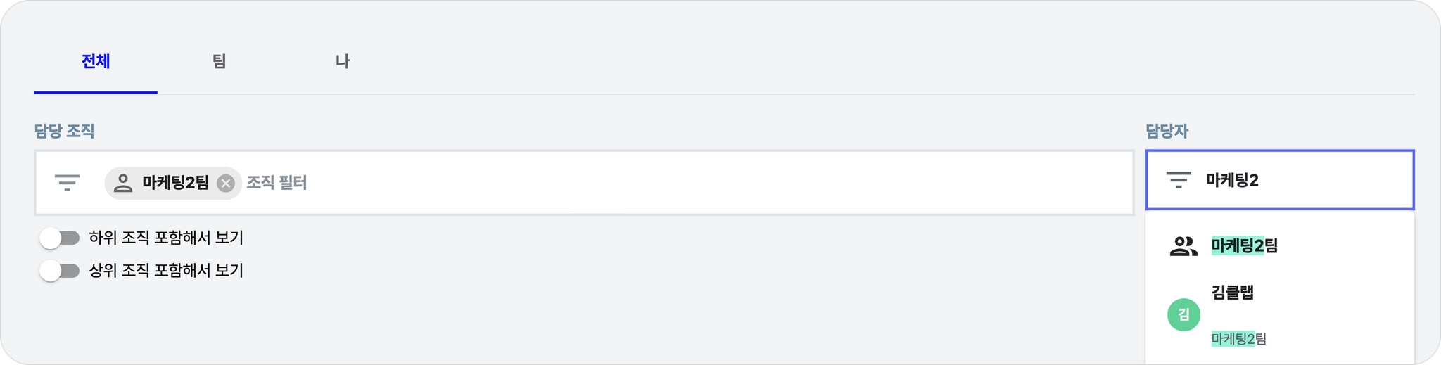 [팀] 탭의 ‘담당 조직’ 필터에서는 본인이 조직도상 속한 팀만 선택할 수 있습니다.