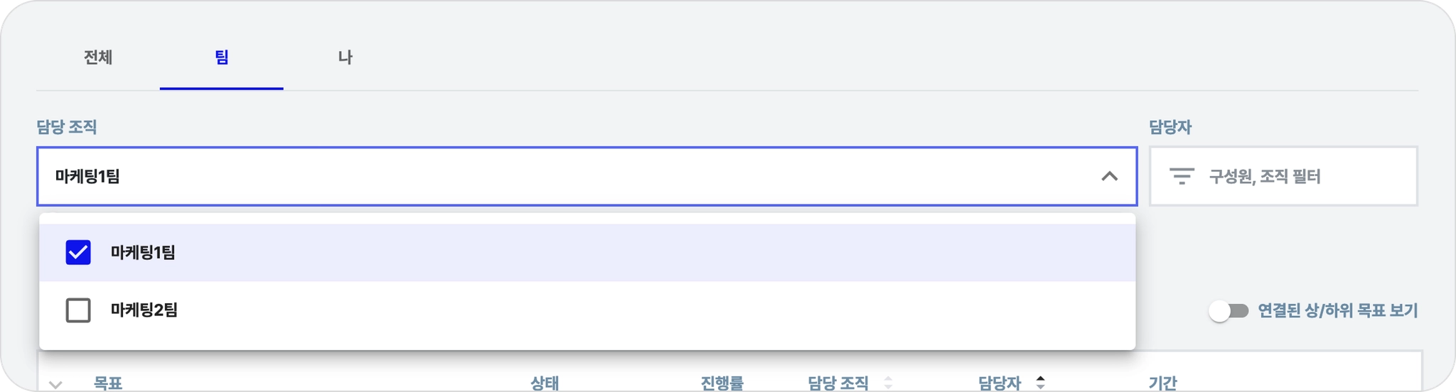 조직도에 복수의 팀에 속한 경우, 원하는 팀을 선택해 해당 팀의 목표만 조회할 수 있어요.