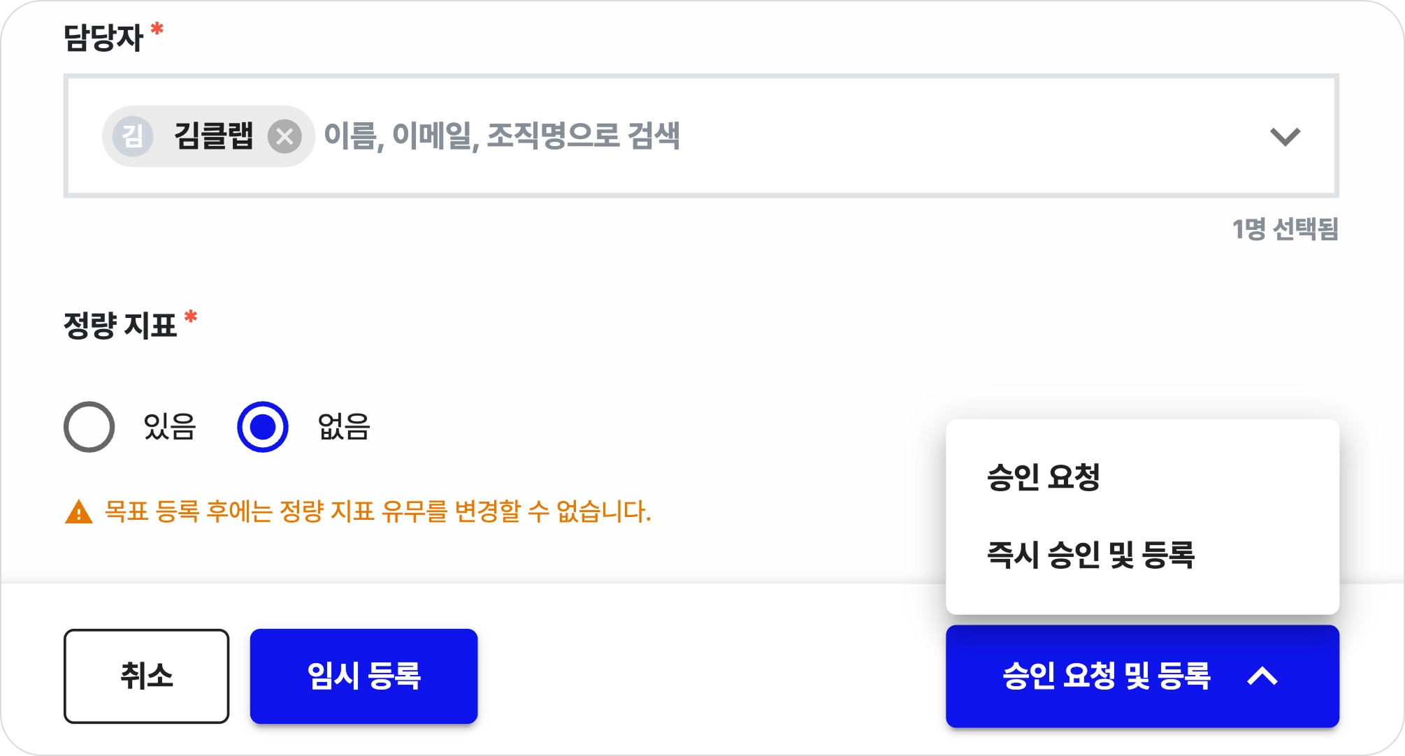 [즉시 승인 및 등록] : 승인 요청 없이 목표가 즉시 승인 완료 상태로 등록됩니다.