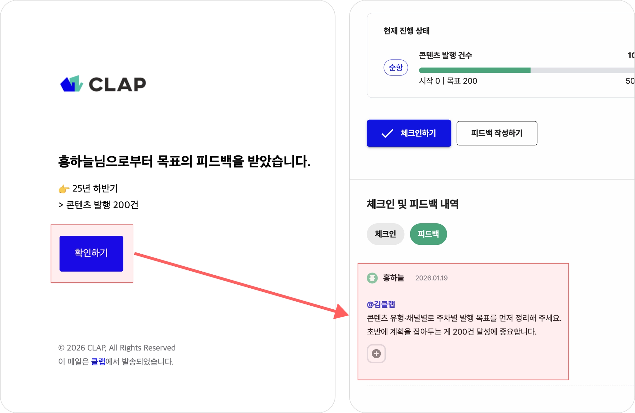 목표 피드백과 관련된 알림은 총 2가지 유형으로 발송됩니다.