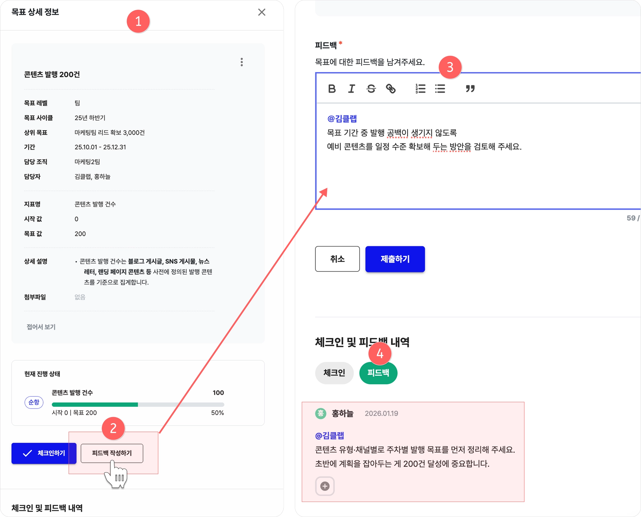(4) 제출한 피드백은 목표 상세 정보 하단의 피드백 내역에 누적되어 확인할 수 있습니다.