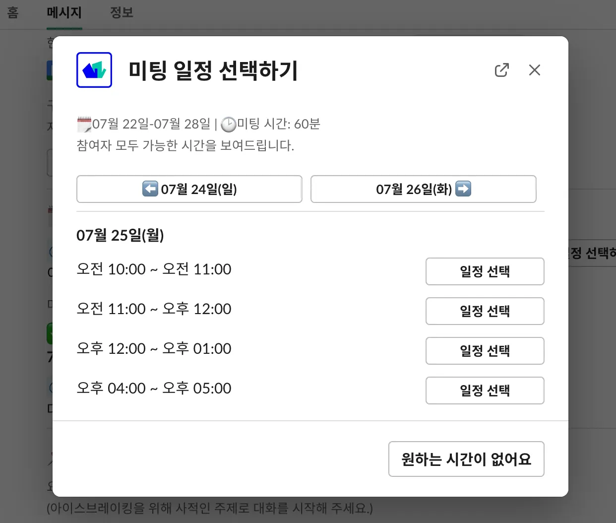선택할 수 있는 일정이 없다면 [원하는 시간이 없어요]를 눌러 매니저에게 알려줍니다.