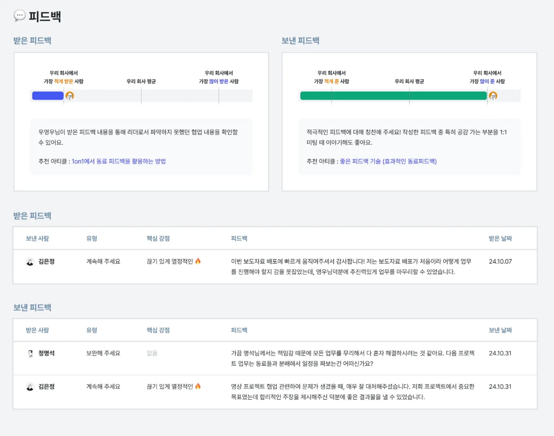 보낸 피드백: 본인이 보낸 피드백을 보고, 최근 협업 관계가 어떘는지 파악할 수 있어요.