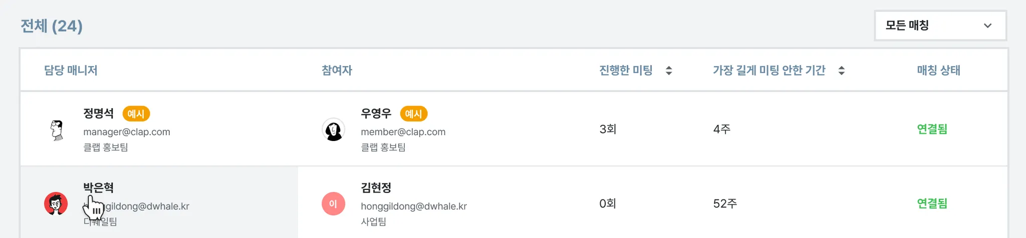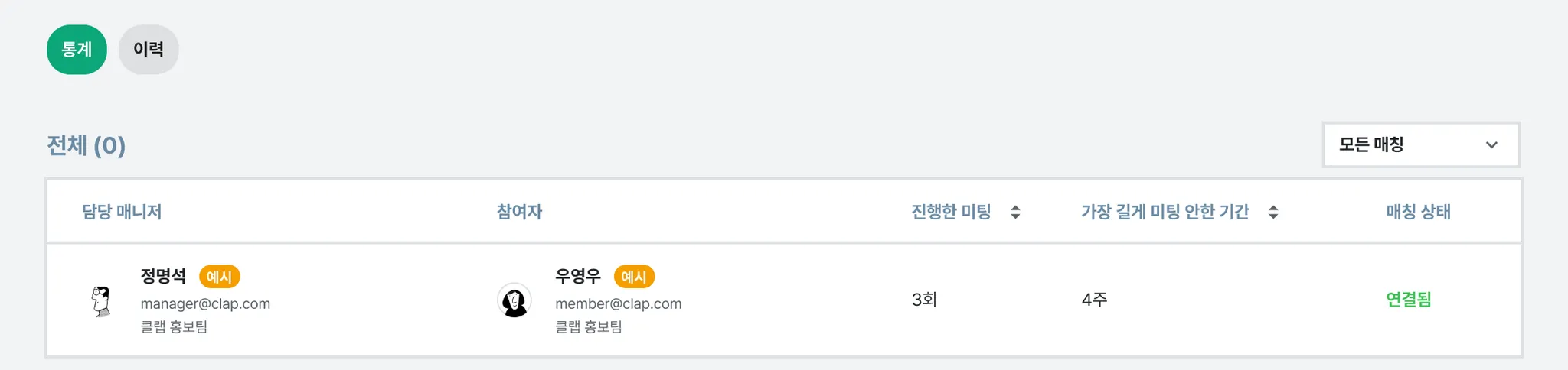 통계: 진행한 미팅 수 / 미팅 기간 / 매칭 상태(매니저가 1:1 미팅 멤버를 등록한 상태)를 확인할 수 있어요.