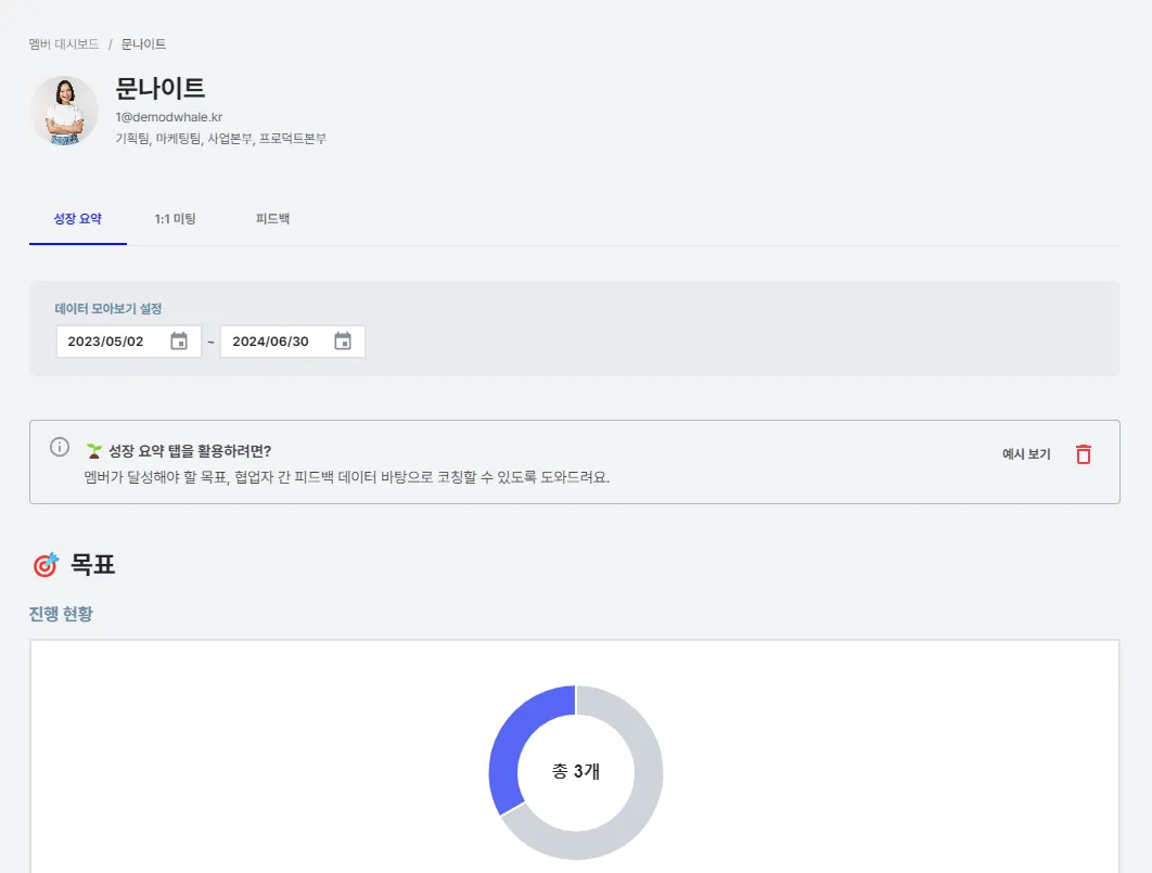 구성원 본인의 1)목표, 2)피드백, 3)리뷰 데이터 내용을 제공합니다.