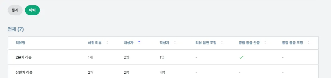 이력: 설정된 기간 내에 조직에서 진행한 리뷰 유형을 확인할 수 있어요.
