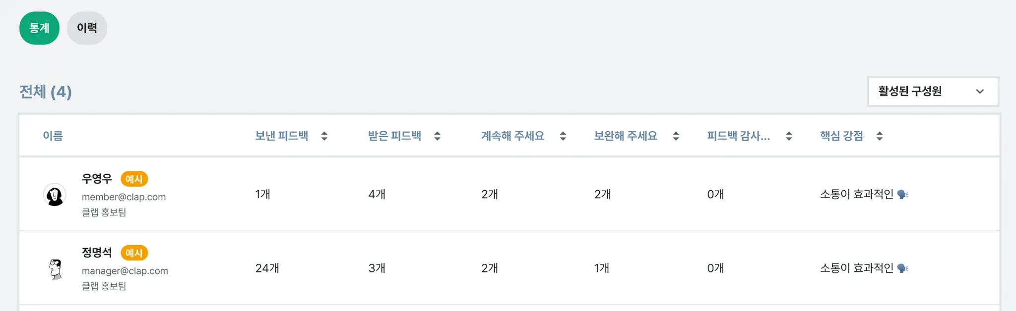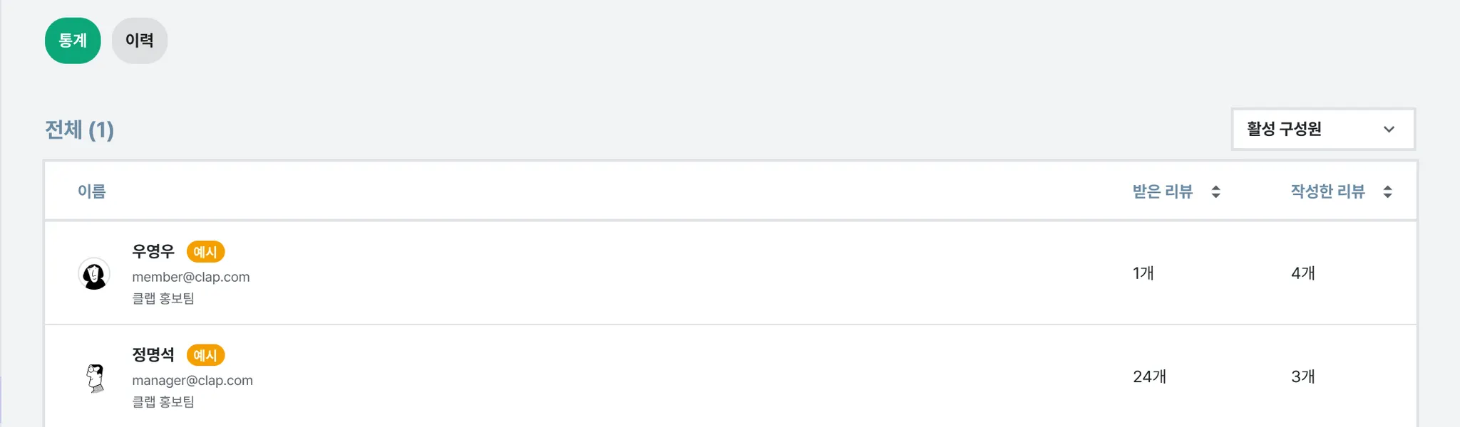 통계: 설정된 기간 내에 구성원이 받은 리뷰 / 작성한 리뷰 개수를 확인할 수 있어요.
