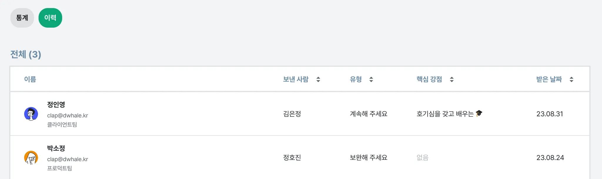 이력: 피드백 보낸 사람 / 피드백 유형 / 핵심 강점 / 받은 날짜를 확인할 수 있어요.
