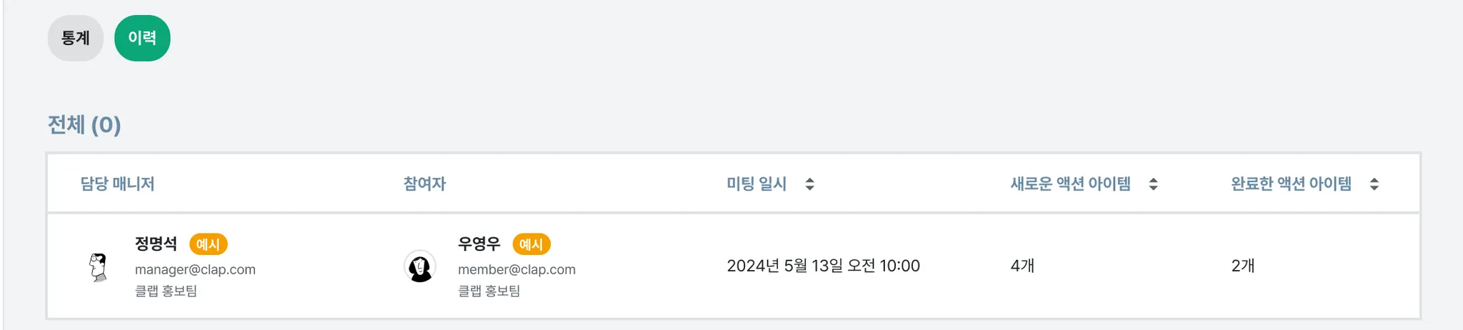 이력: 미팅 일시 / 새로운 액션 아이템 수 / 완료한 액션 아이템을 확인할 수 있어요.