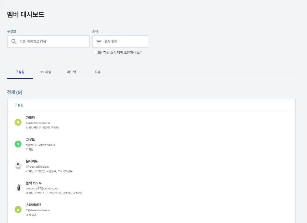관리자는 멤버 대시보드를 통해 구성원 정보, 구성원의 참여 통계와 상세 내역을 확인할 수 있습니다.