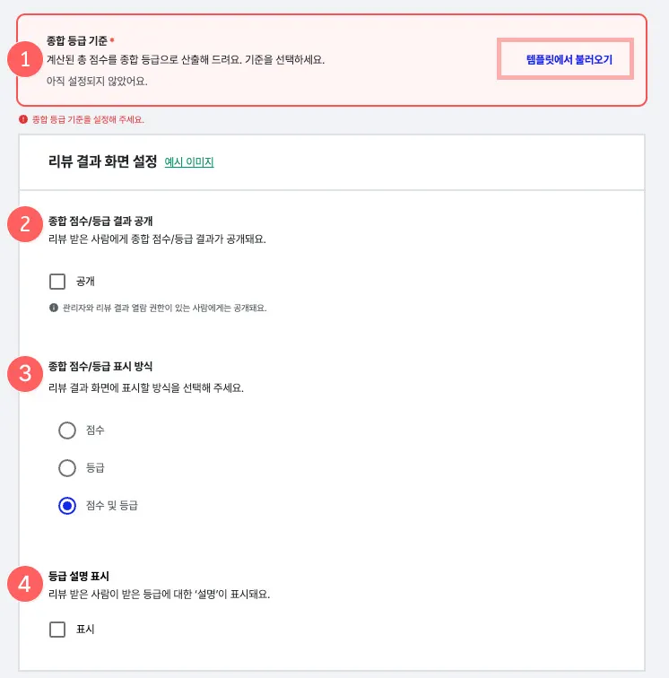 (3) 종합 점수/등급 표시 방식 : 옵션 선택에 따라 리뷰 결과 조회 화면에 표시할 방식을 선택할 수 있어요.