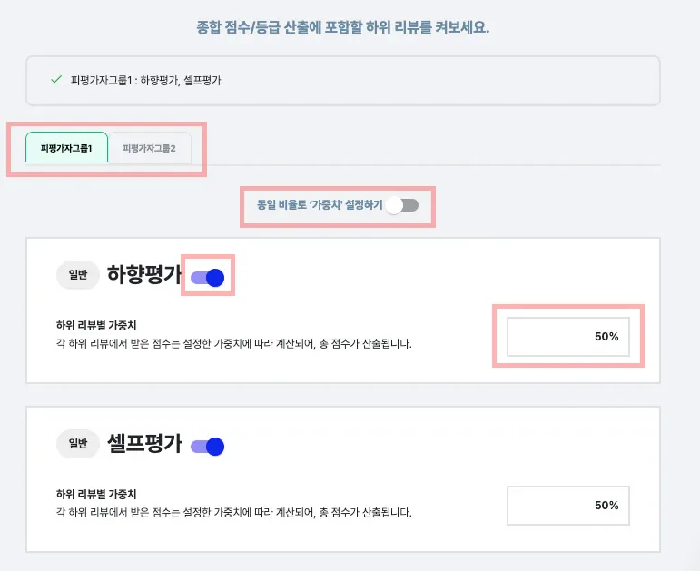 최종 점수/등급을 산출의 기준이 되는 하위 리뷰별 가중치를 피평가자 그룹별로 설정할 수 있습니다.