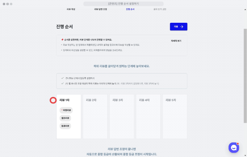 각 하위 리뷰 순서를 정해서 리뷰 단계를 나눠 진행할 수 있어요.