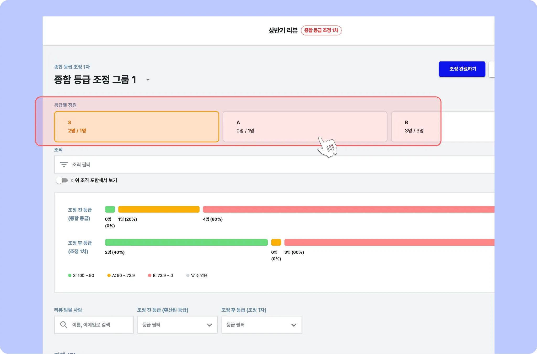 조정자 화면 상단에서 현재 인원 / 정원 현황을 확인하며 최종 등급을 확정할 수 있어요.