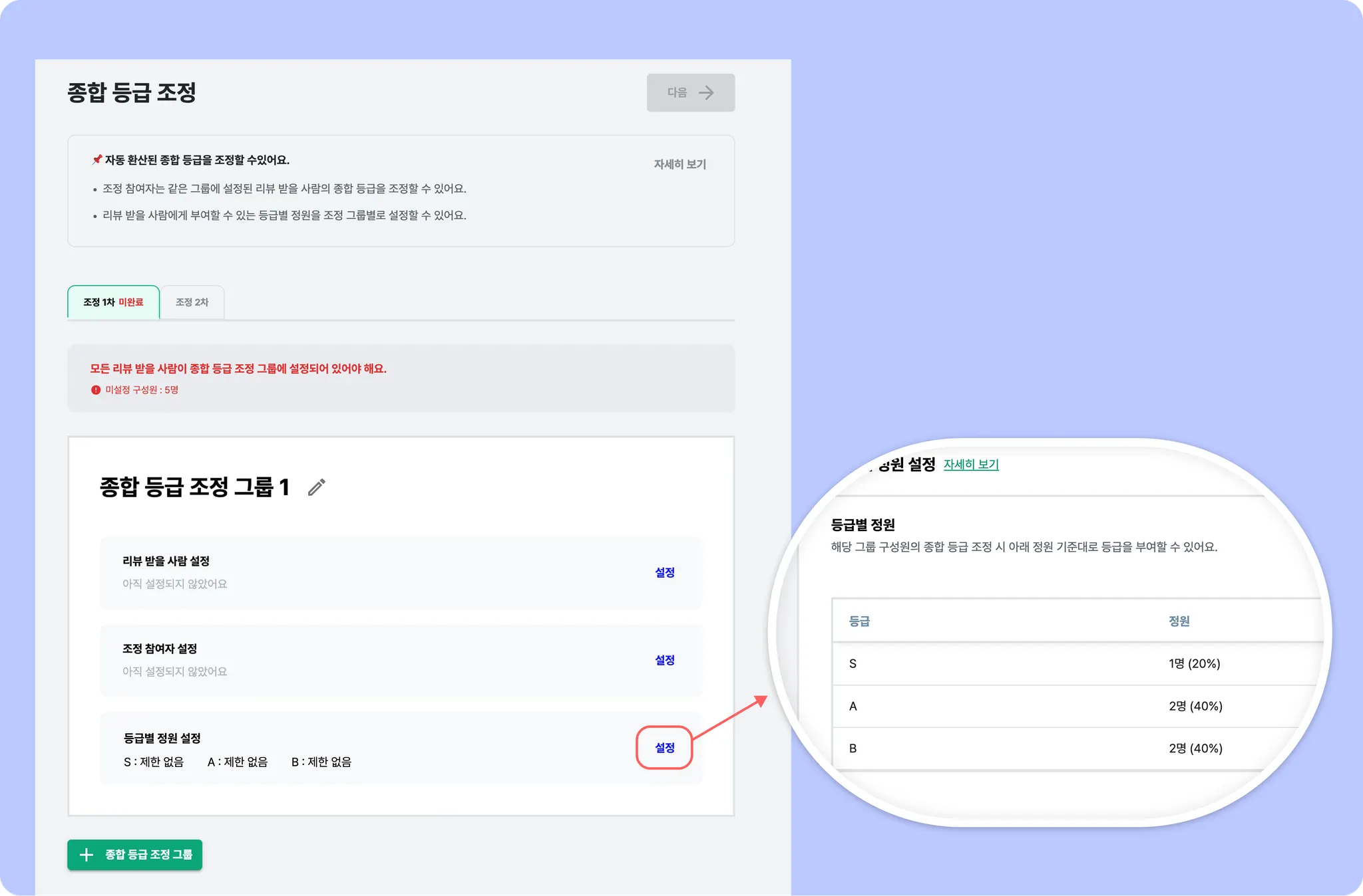 각 그룹 안에서 등급별 정원(특정 등급에 배정할 수 있는 최대 인원 수)을 설정할 수 있어요.