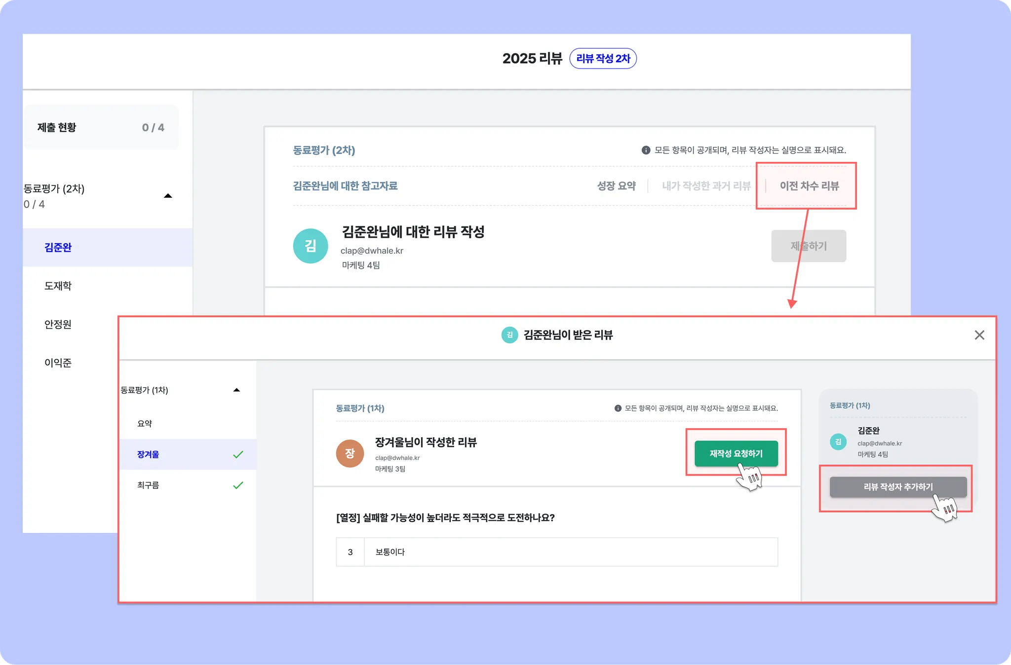 참고자료 활용 강화: 이전 차수 리뷰에서 재작성 요청과 평가자 추가를 바로 진행할 수 있어요.