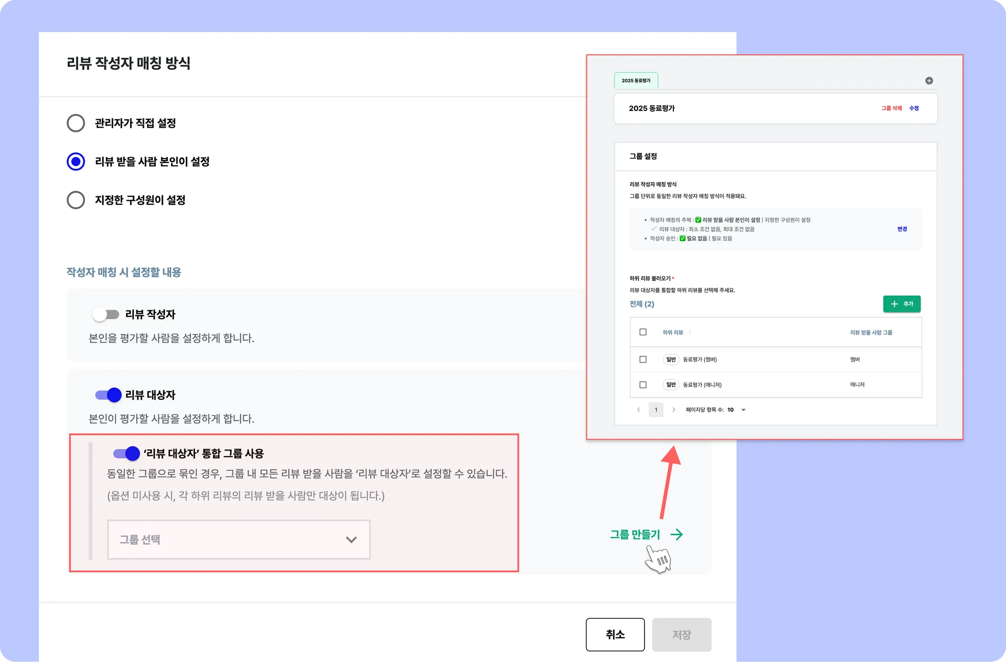 관리자가 [리뷰 대상자 통합 그룹]을 설정해 구성원의 선택 가능한 범위를 넓힐 수 있습니다.