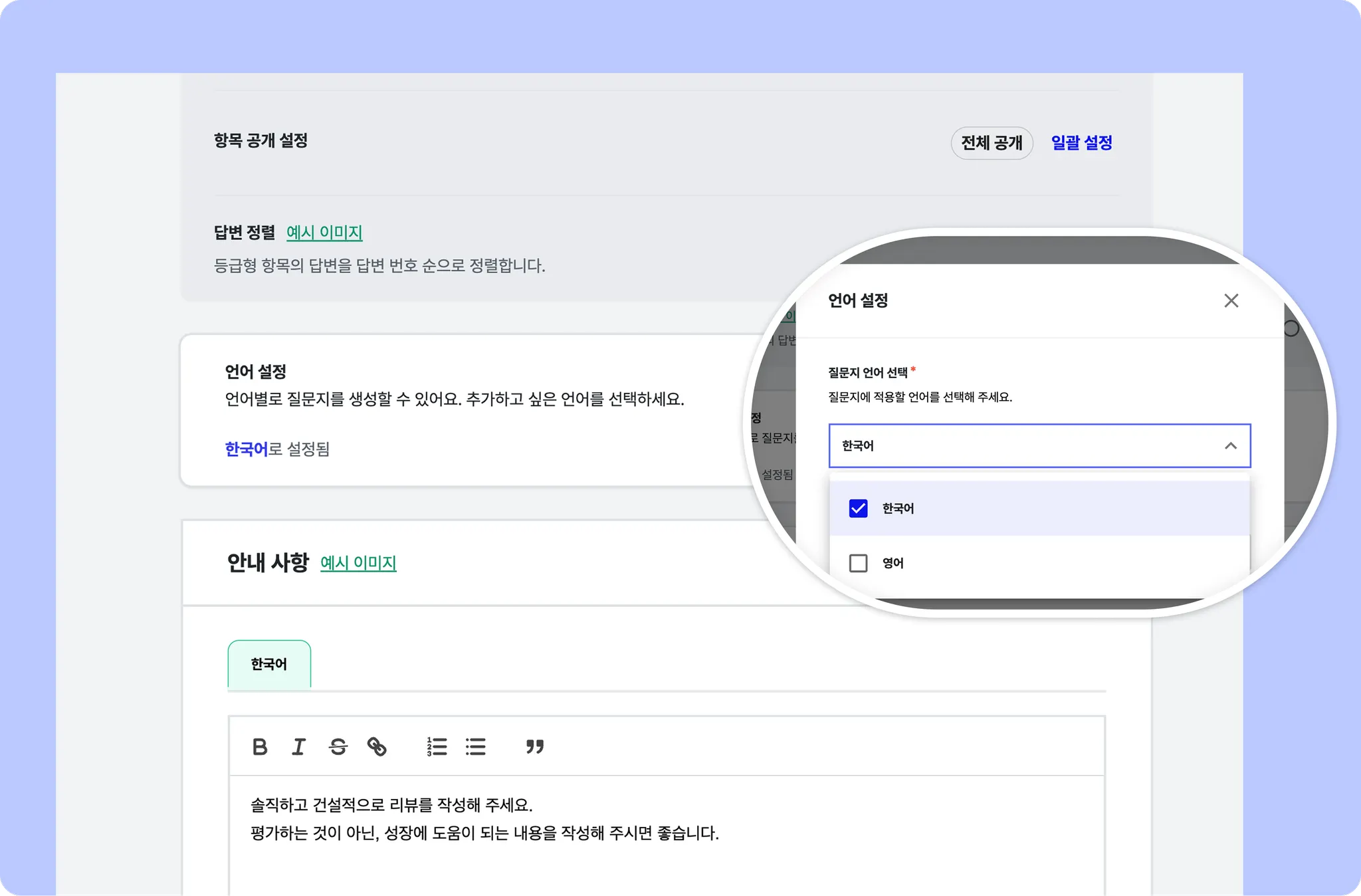 질문지(일반 리뷰 템플릿) 또는 등급 설명(종합 등급 템플릿)을 영어로 구성할 수 있습니다.