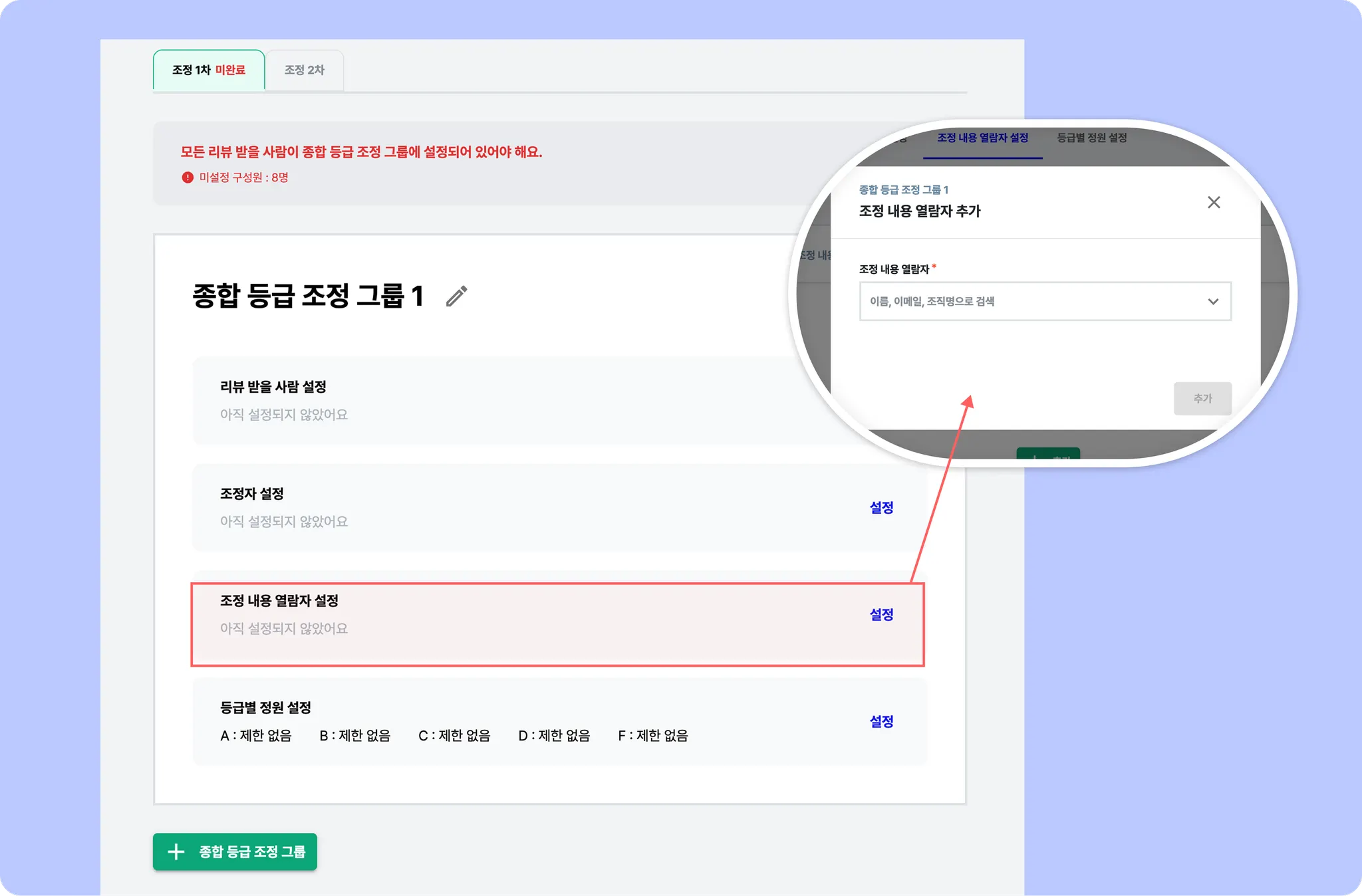 관리자는 조정 그룹 설정 화면에서 조정자와 조정 열람자를 함께 추가할 수 있습니다.