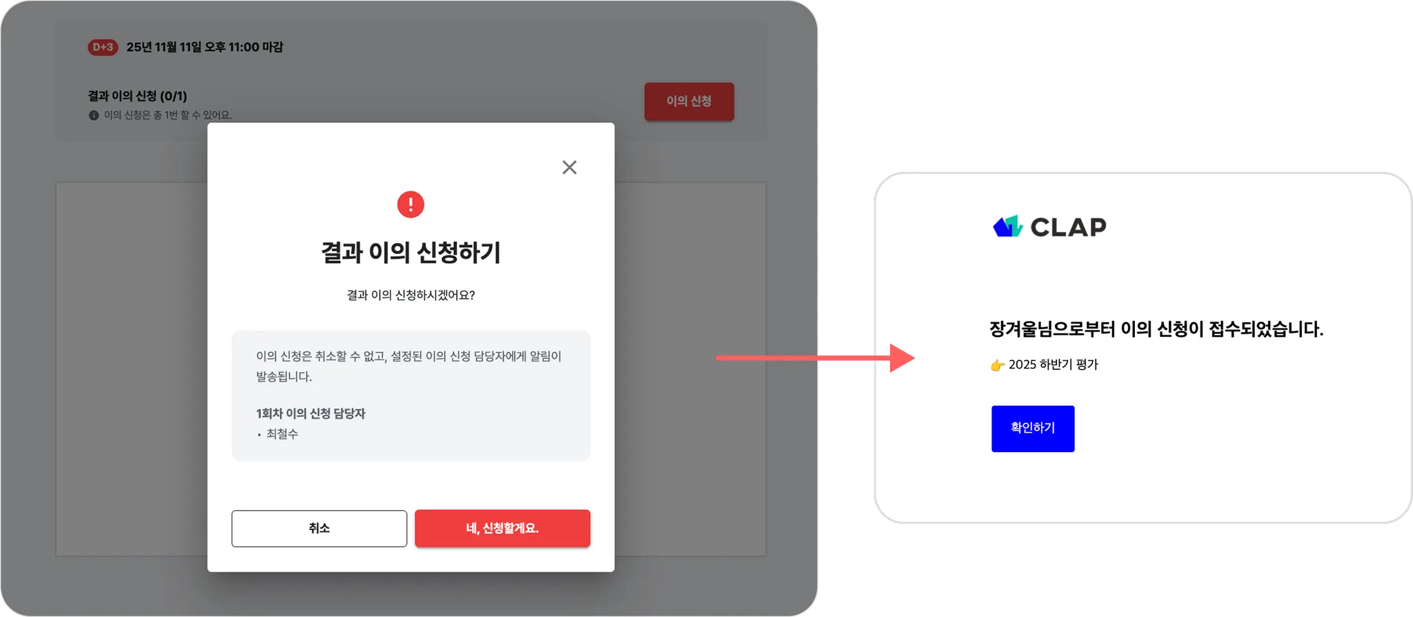 관리자가 설정한 담당자와 회차에 따라, 구성원은 정해진 단계만큼 이의 신청을 진행할 수 있습니다.