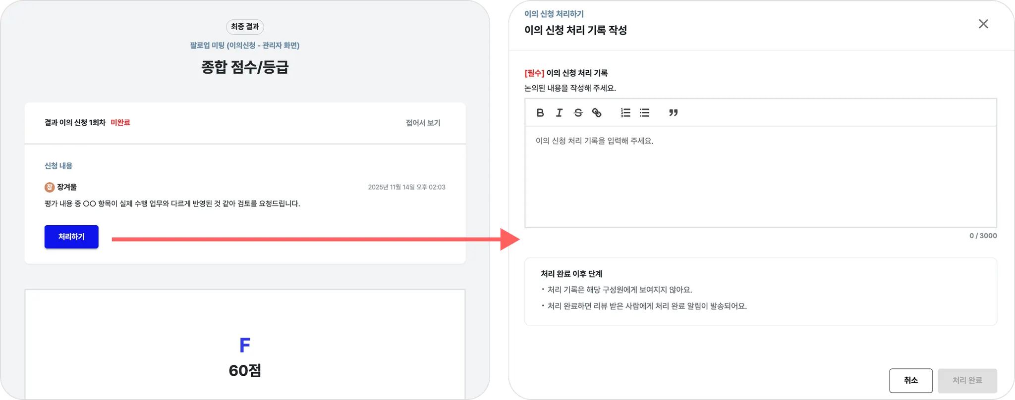 작성된 기록은 구성원에게는 보이지 않으며, 이의신청 처리 이력 + 인사노트에 저장됩니다.