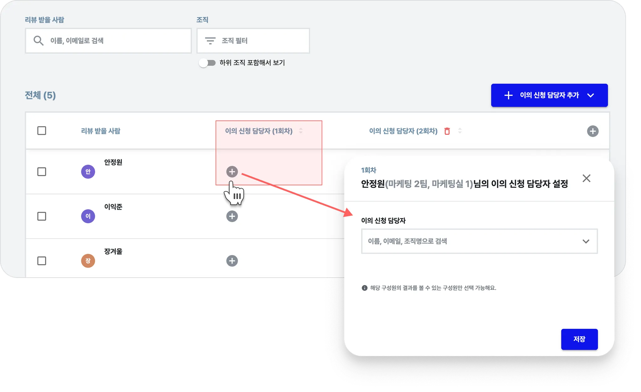 담당자는 해당 구성원의 리뷰 결과를 열람할 수 있는 사람만 지정할 수 있어요.