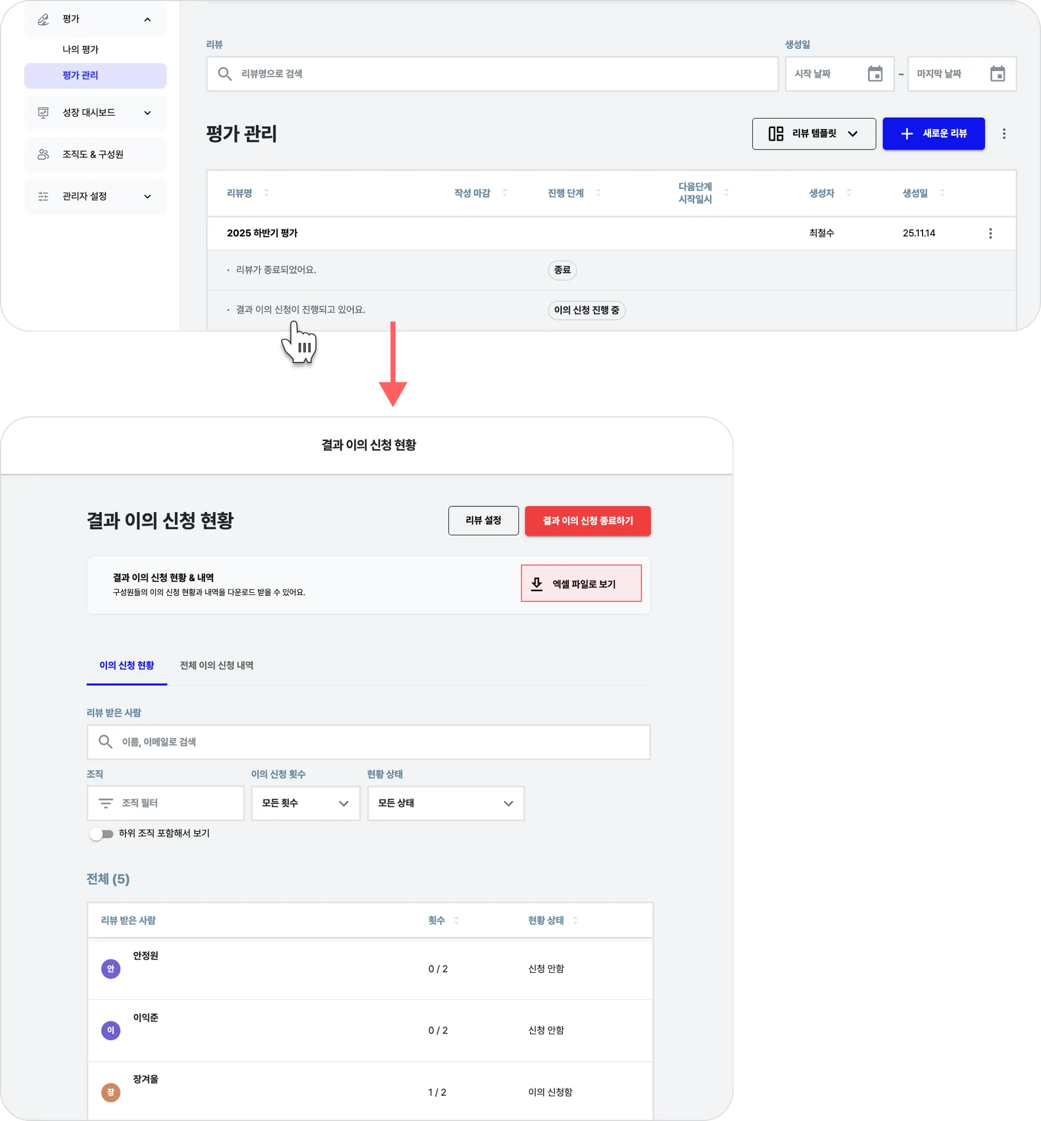 모든 이의신청이 처리되면, 화면 상단의 [결과 이의 신청 종료하기] 버튼을 눌러 이의신청 프로세스를 마무리할 수 있습니다. (종료하지 않으면 구성원이 계속 이의신청을 제출할 수 있어요.)