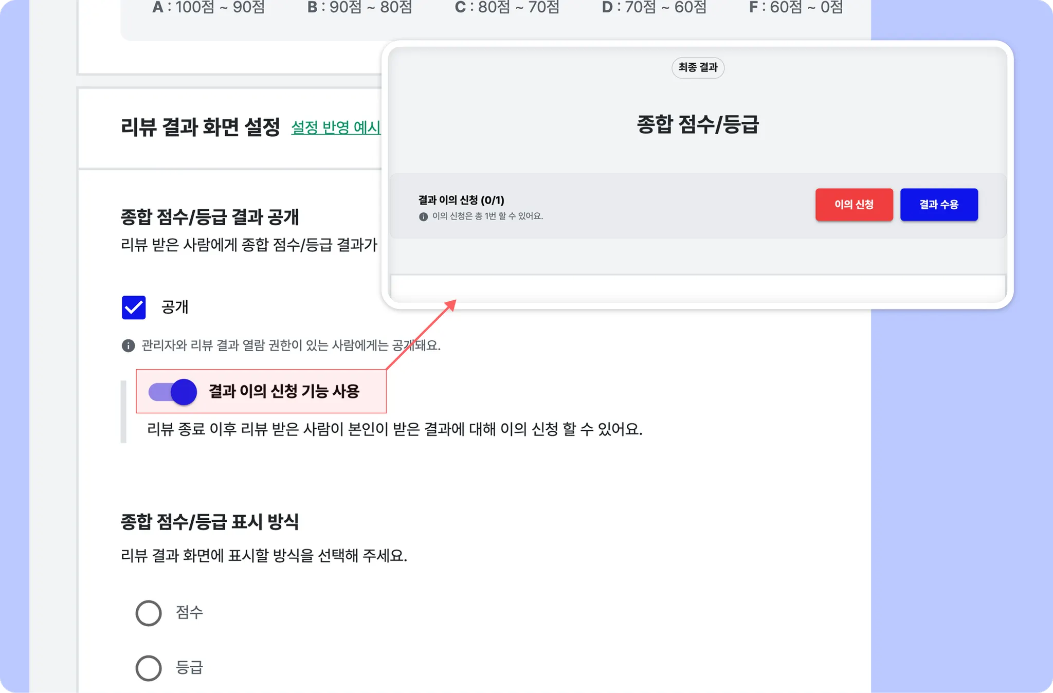 이의신청 기능을 사용하면 구성원은 결과 확인 후 [결과 수용]으로 검토를 마치거나, [이의신청]을 통해 결과에 대한 재검토를 요청할 수 있습니다.
