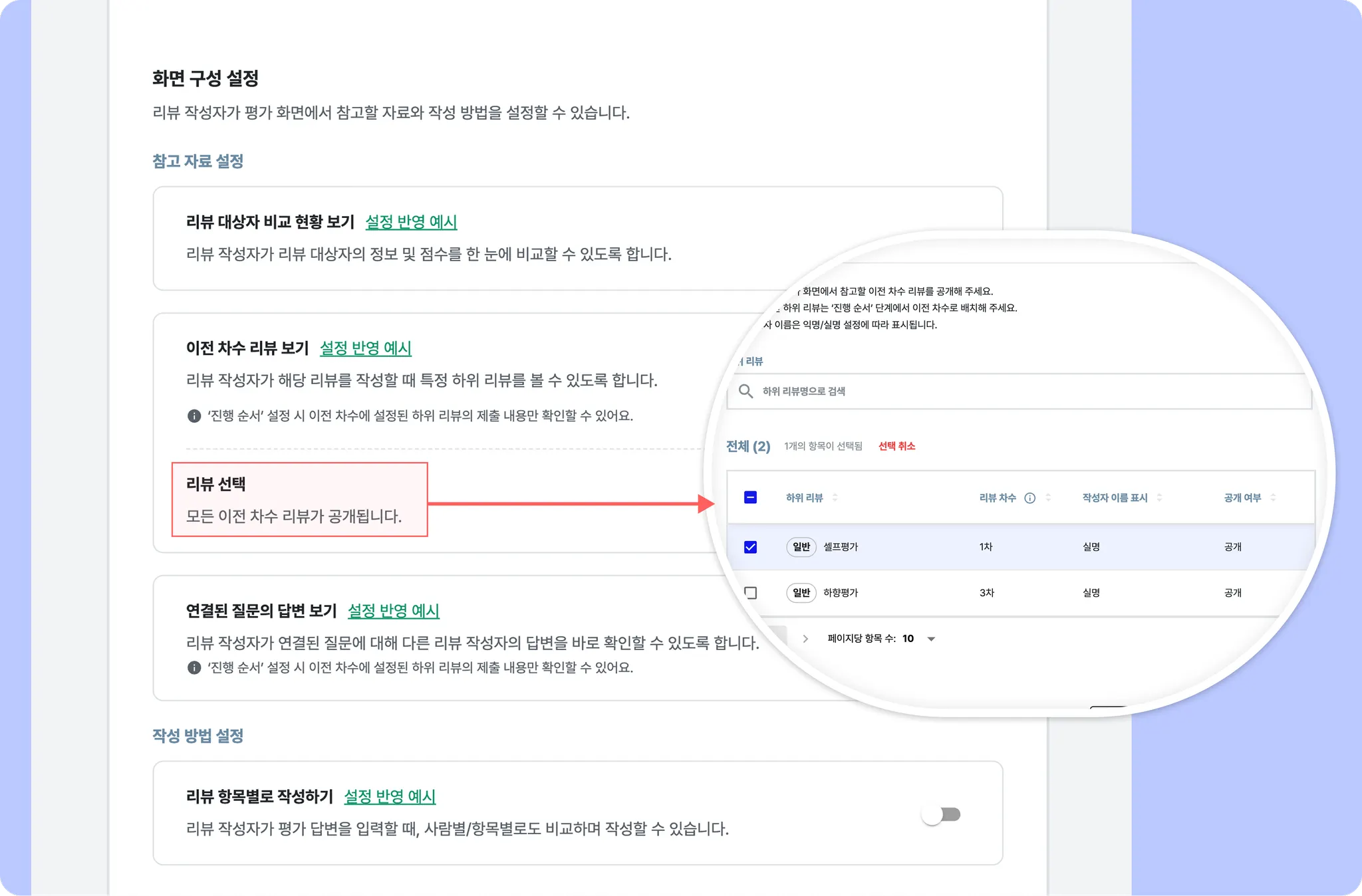 관리자는 리뷰를 세팅할 때 하위 리뷰별로 앞 차수 리뷰를 ‘공개’ 또는 ‘비공개’로 설정할 수 있어요.