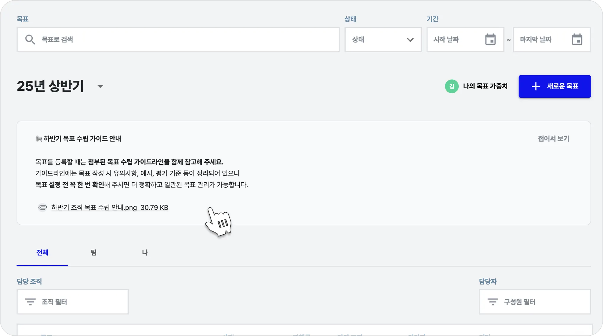 구성원은 목표를 작성하기 전에 필요한 자료를 한눈에 확인하고 다운로드할 수 있어요.