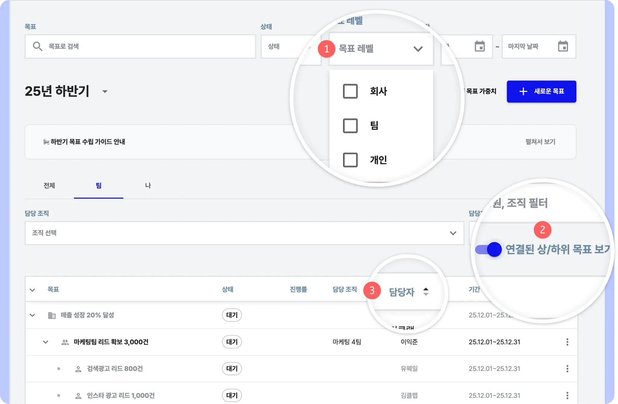 (3) 목표 테이블에서 담당 조직명 또는 담당자명을 정렬 기능을 통해, 목표를 원하는 순서로 확인할 수 있어요.