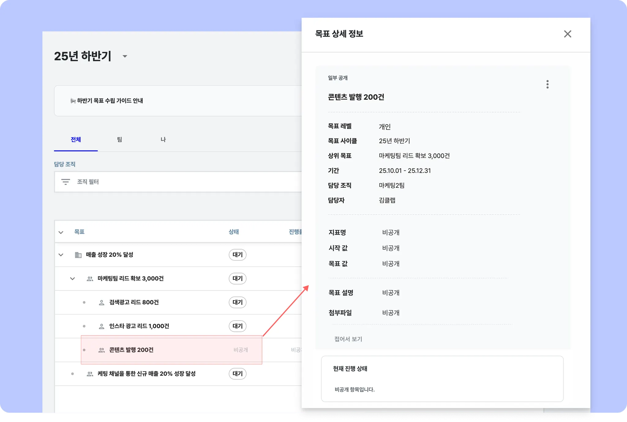 목표의 구체적인 진행 내용은 공개하지 않도록 제한할 수 있어요.