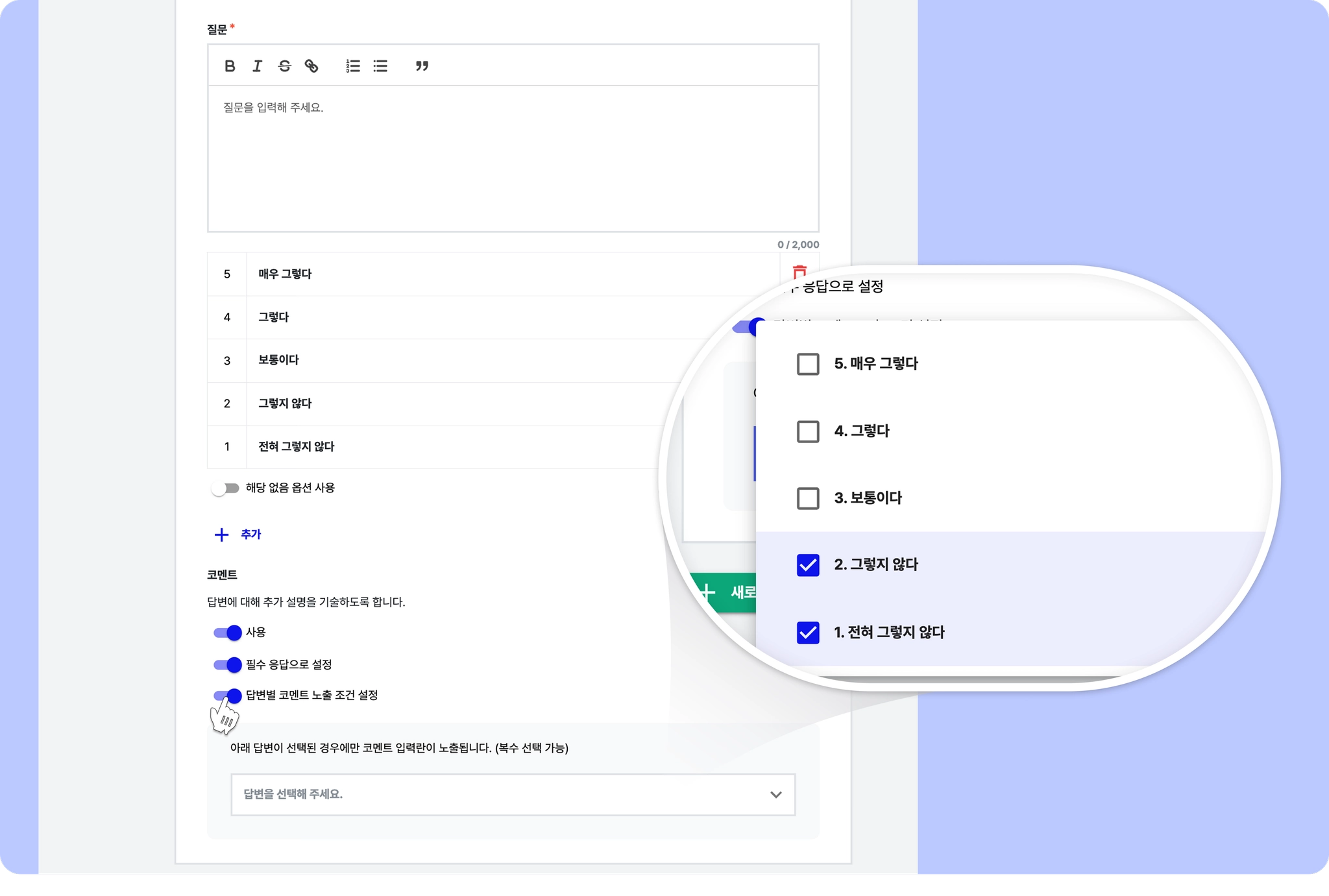 이 문항에서 관리자가 그렇지 않다, 전혀 그렇지 않다 에만 코멘트 입력을 설정해 두었다면,