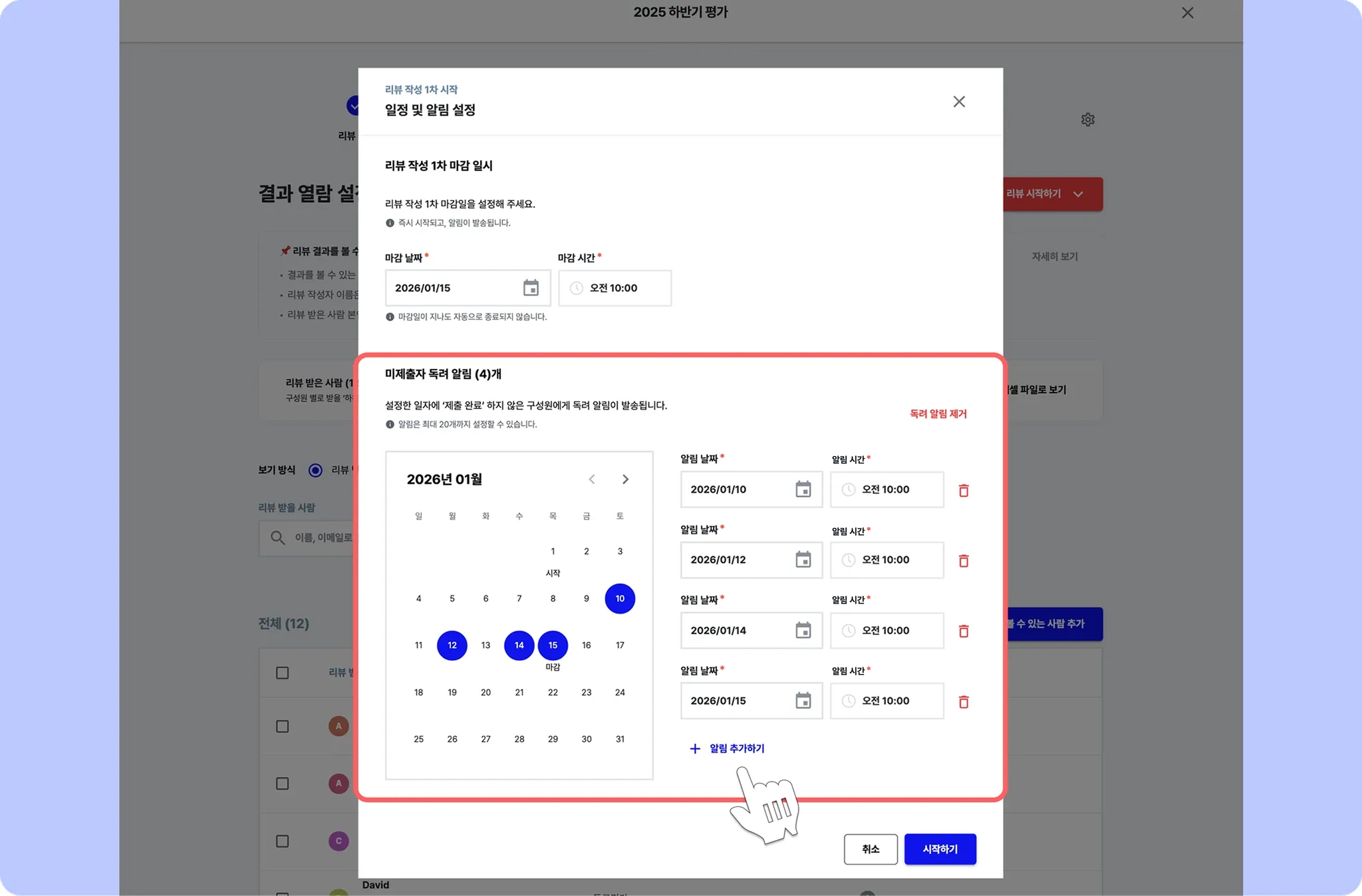 독려 알림 일정은 수정하거나 삭제할 수 있어, 조직의 리뷰 운영 방식에 맞게 조정할 수 있어요.