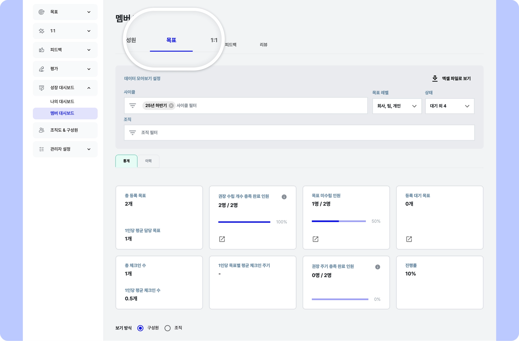 목표 대시보드는 조직과 구성원의 목표 수립 현황과 체크인 진행 상황을 한 화면에서 요약해 확인할 수 있는 관리 화면입니다.
