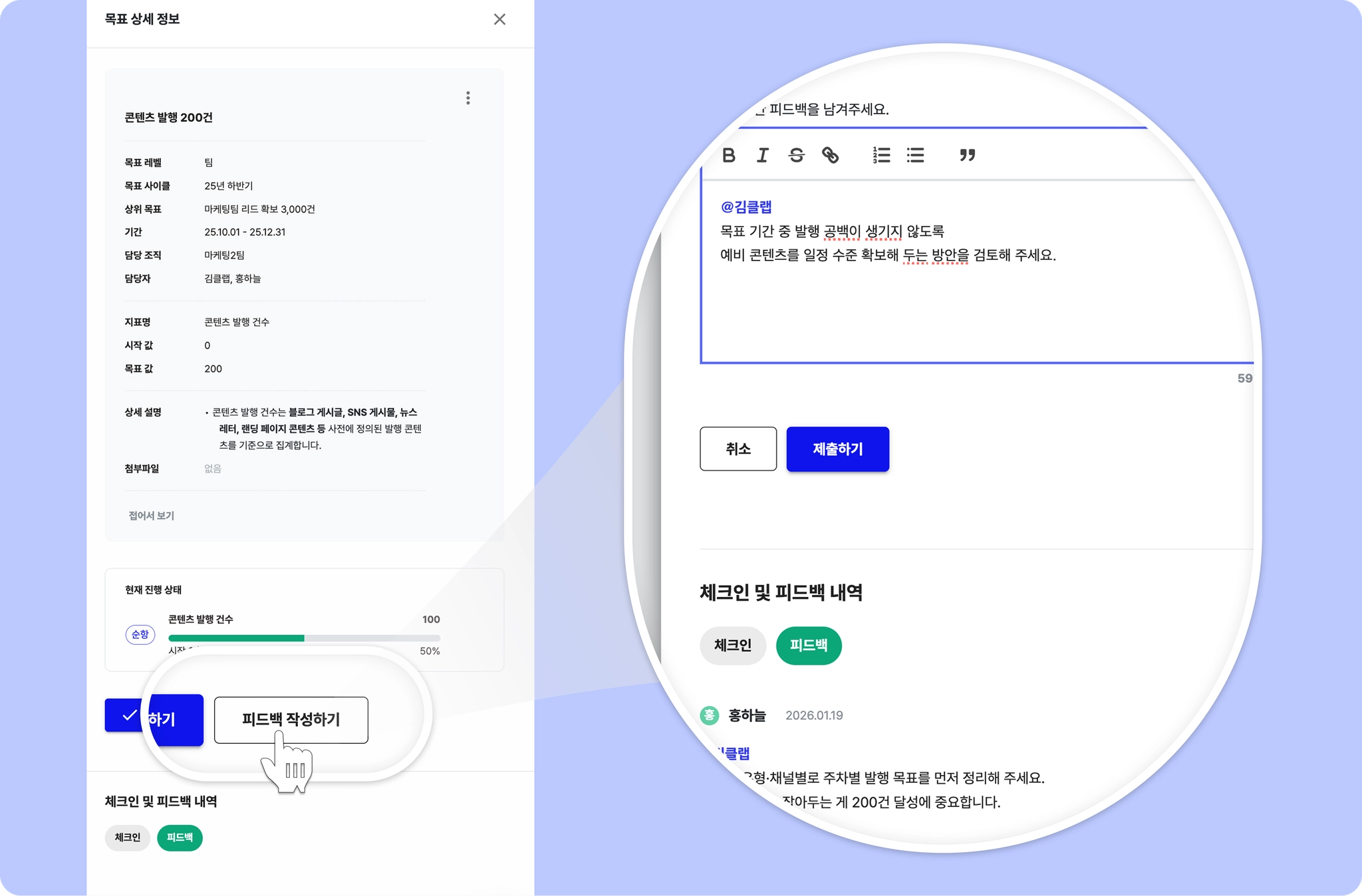 피드백은 해당 목표의 상세 정보를 볼 수 있는 구성원만 작성하고 확인할 수 있어요.