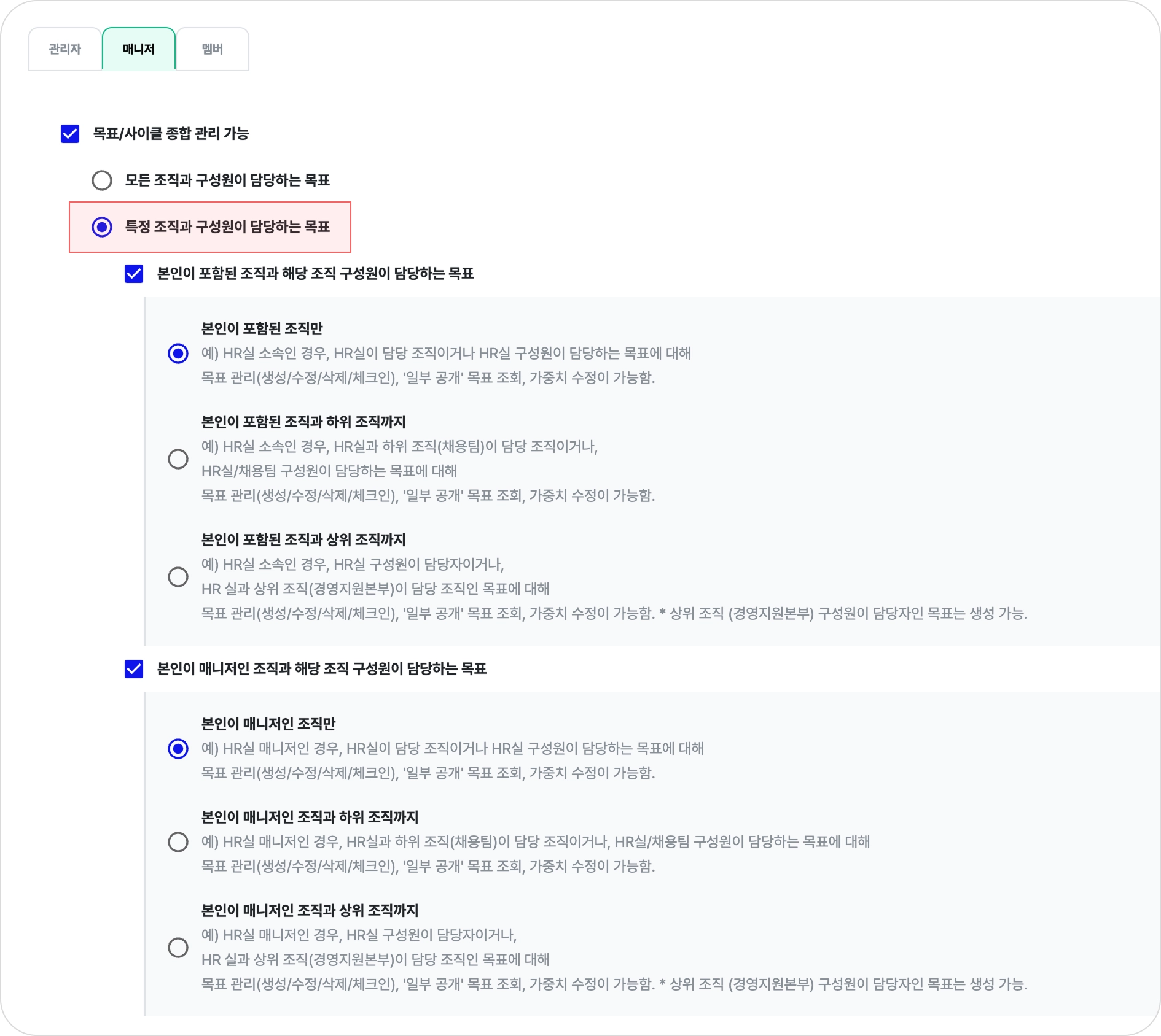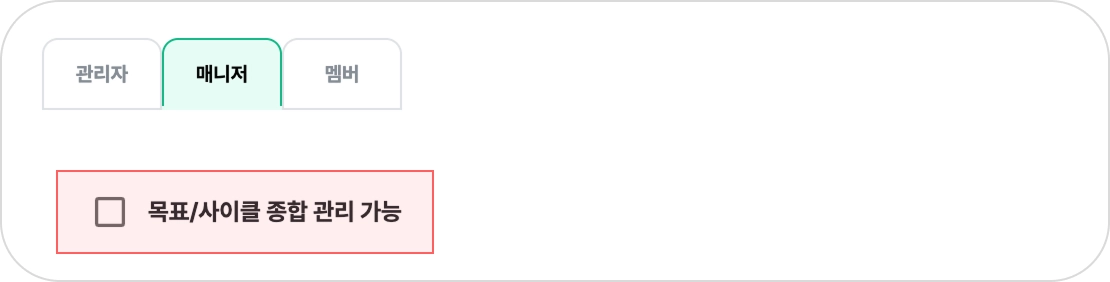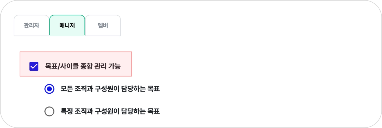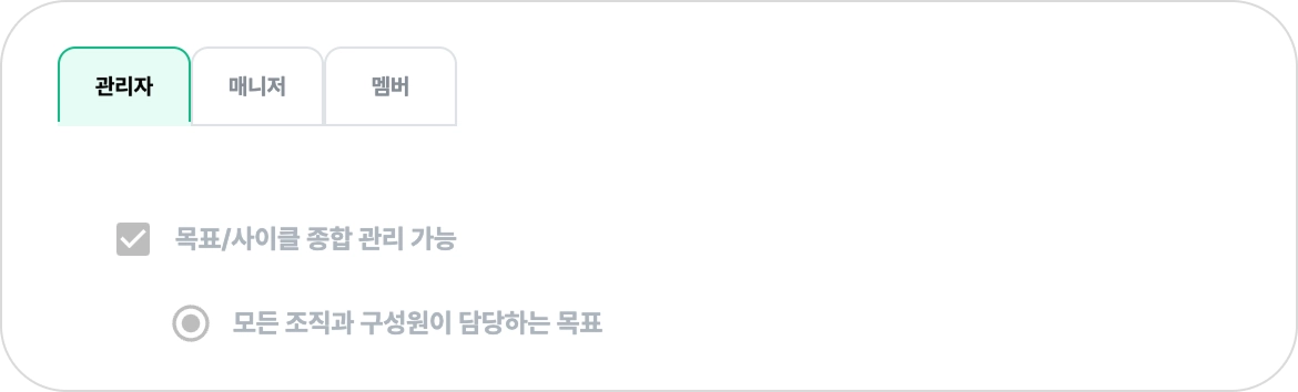 매니저는 설정된 조직/구성원 범위 내에서 목표를 생성하고 관리할 수 있습니다.