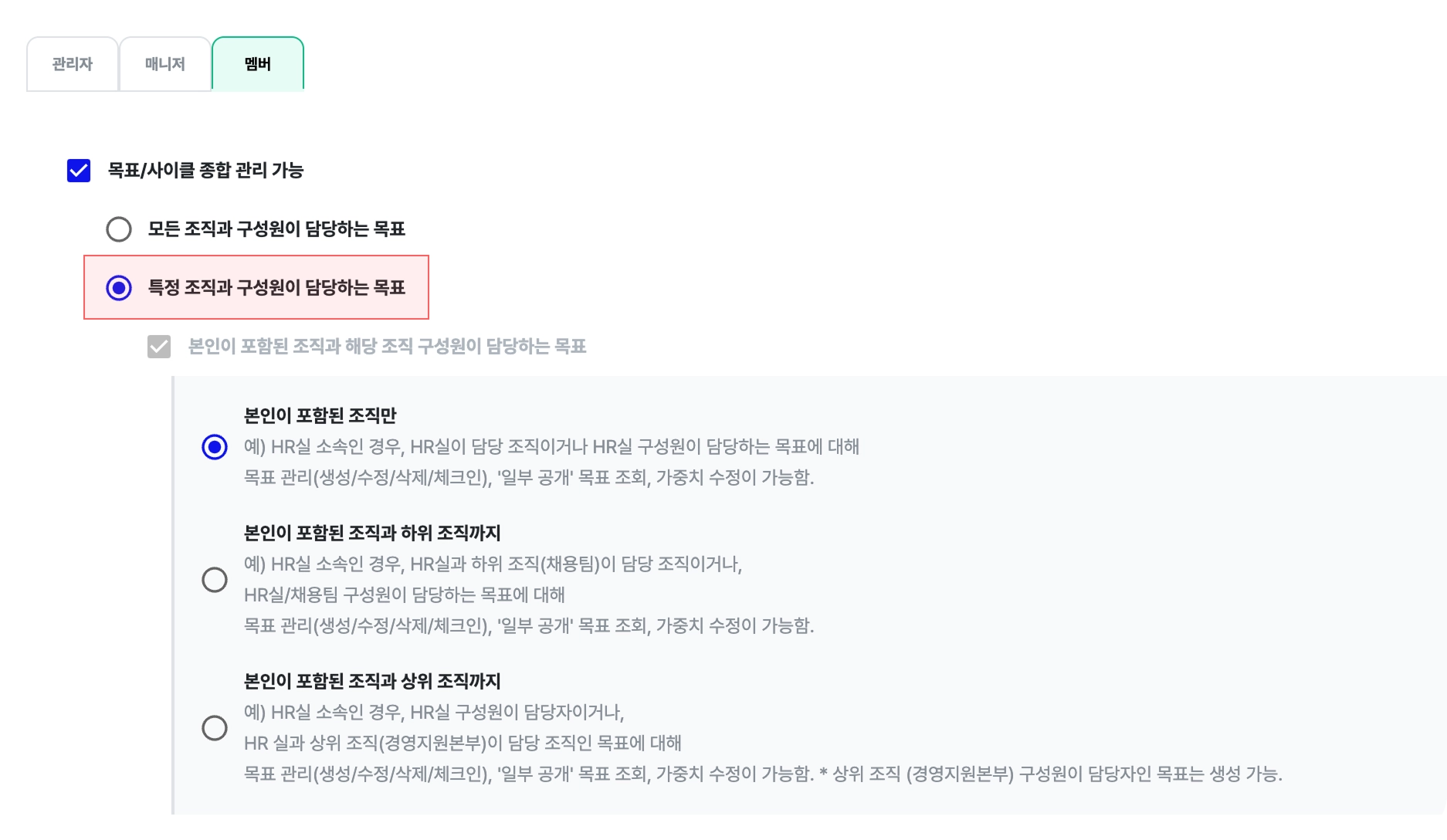 멤버는 설정된 범위 내에서 목표를 관리할 수 있습니다.