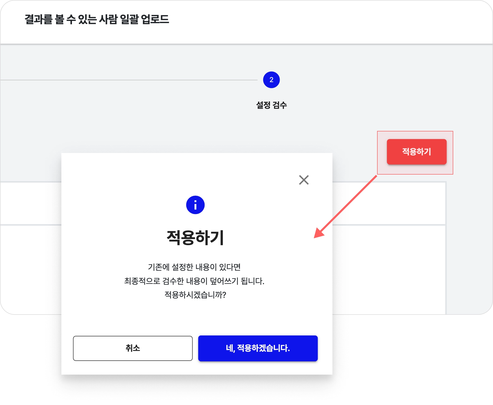 (2) 최종 확인 팝업에서 [네, 적용하겠습니다.] 버튼을 누르면 설정이 최종 반영됩니다.