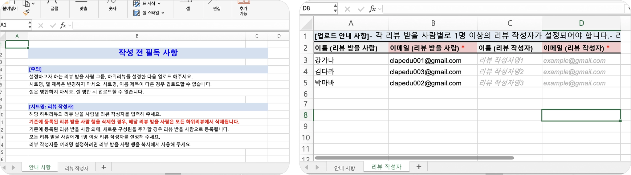 리뷰 받을 사람 기준으로 옆 열에 리뷰 작성자 이름과 이메일 주소를 입력해 주세요.