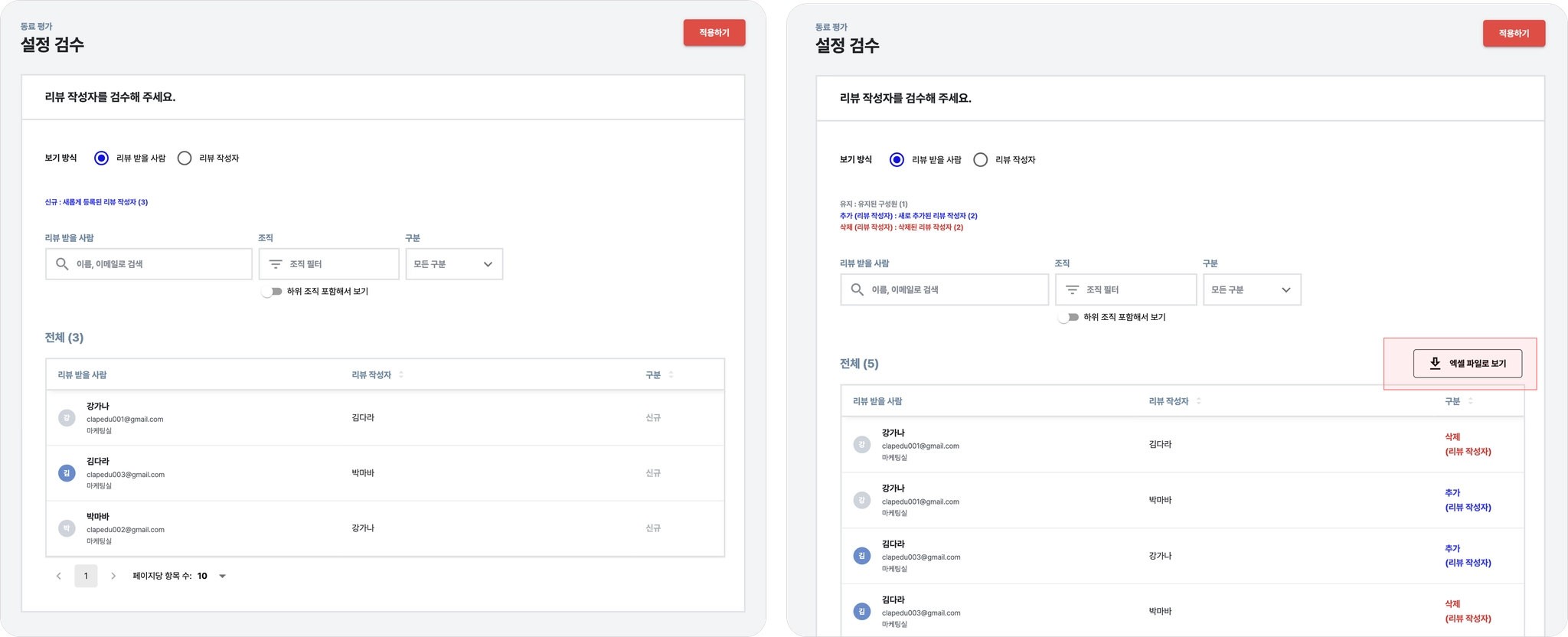 엑셀 다운로드 전 설정 단계에서 이미 추가된 리뷰 대상자 및 리뷰 작성자가 있는 경우,