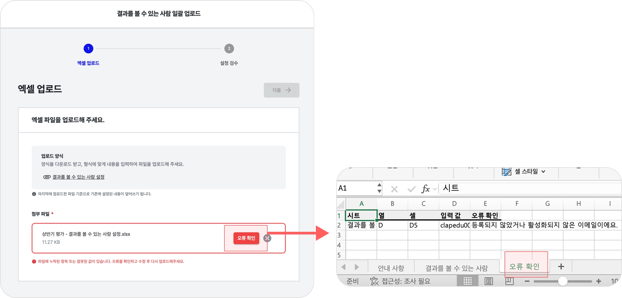 (2) 다운로드한 엑셀 파일에서 ‘오류확인’ 시트를 열어 오류 내용을 확인합니다.